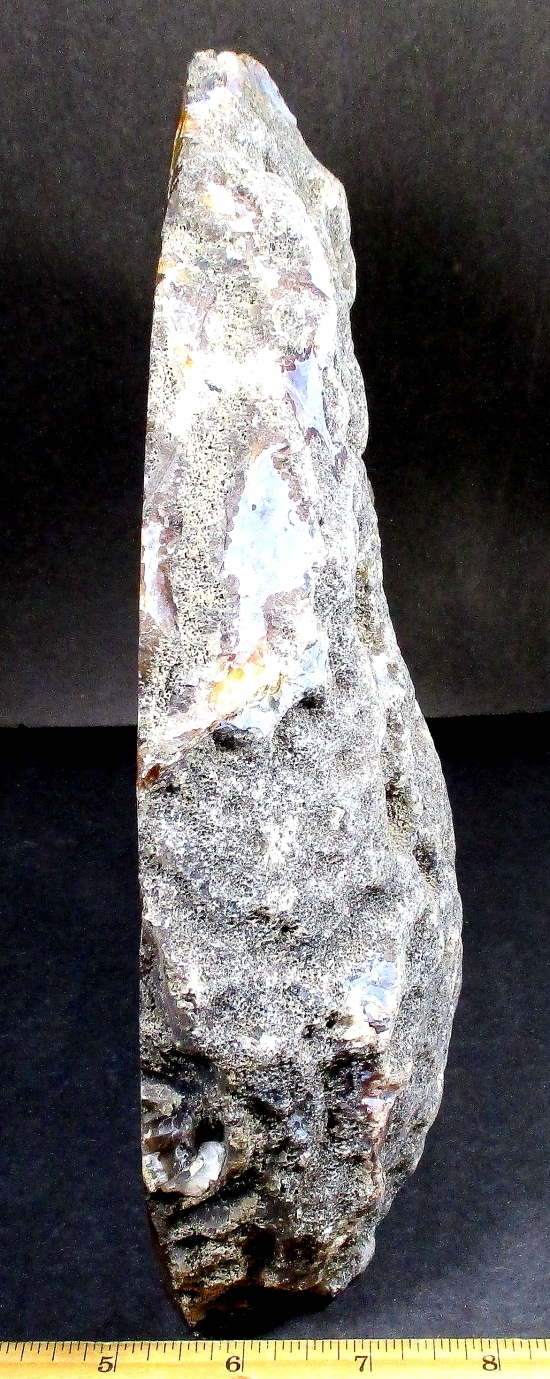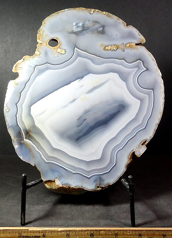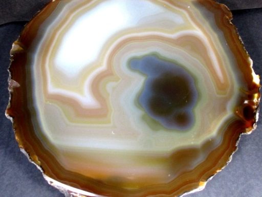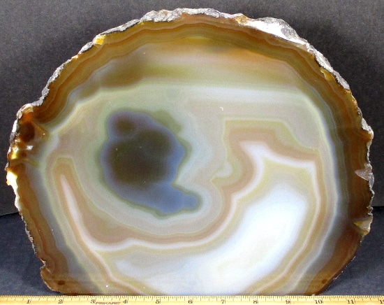 Here’s an exceptional Brazilian Agate Geode slab. This slab measures 10 1/2″ wide x 9″ tall x 2 1/2″ thick, weighs over 11 pounds with a nicely polished face. It has been cut so it can display on its own. It has great colors, amazing banding and fascinating design.  A true beauty that would dress up any home!