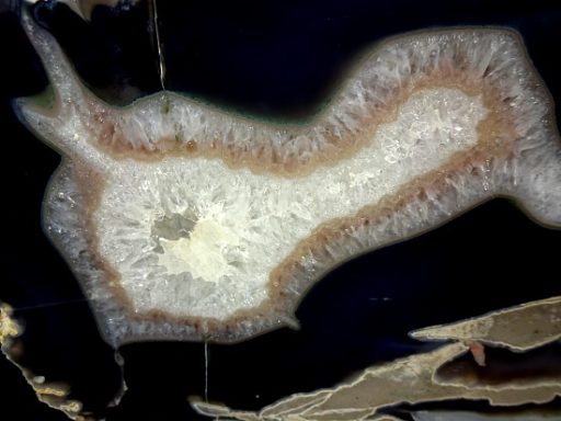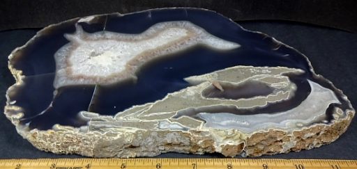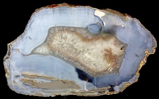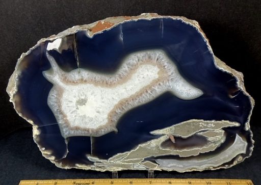 Here’s a beautiful Brazilian Agate Geode slab with a lovely design and color scheme. This slab has an amazing crystal  center surrounded by beautiful Agate crystal and banding. This slab measures 12 1/2″ wide x 8″ tall x 7/8″ thick with a nicely polished front face.
