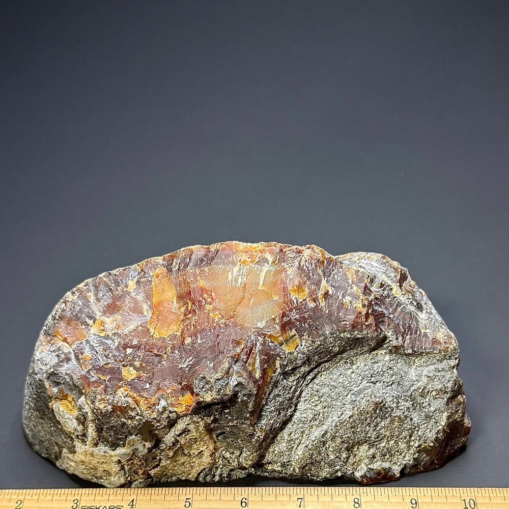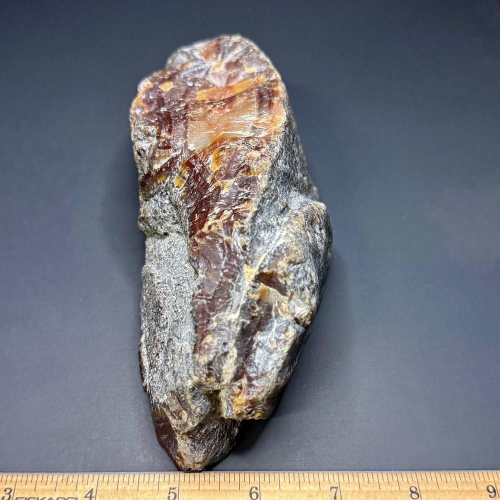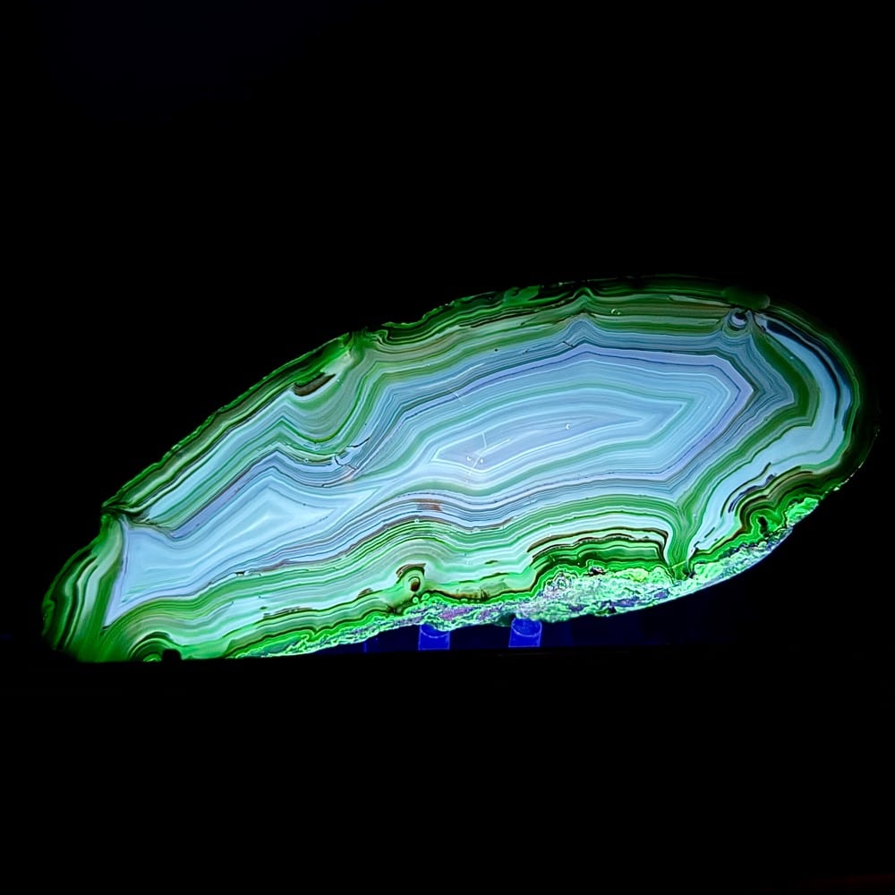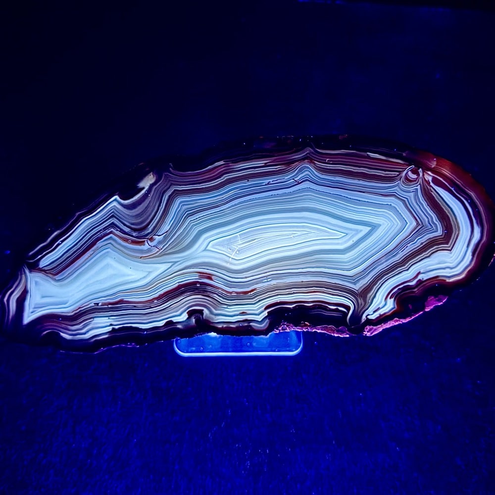 Appearance: High polish front. – Rough back. Exceptional banding. UV Fluorescent SW- green LW- bluish purple color.