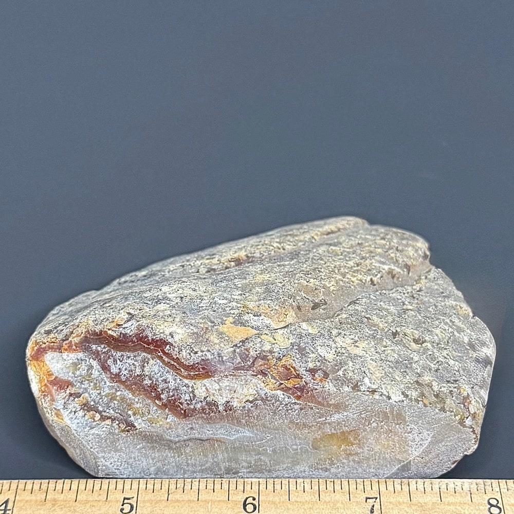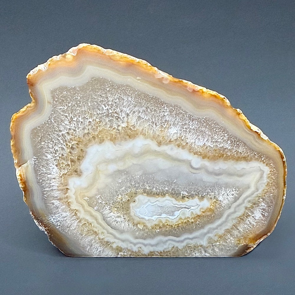 Brazilian Agate is a semi-precious gemstone found in Brazil. It is a variety of chalcedony, a mineral in the quartz family, and is known for its distinctive, multicolored banding patterns that can range from white to various shades of brown, red, blue, green, and yellow. These gemstones originate from the southern region of Brazil, specifically around Rio Grande do Sul, and their formation is linked to volcanic activity from the late Permian age.