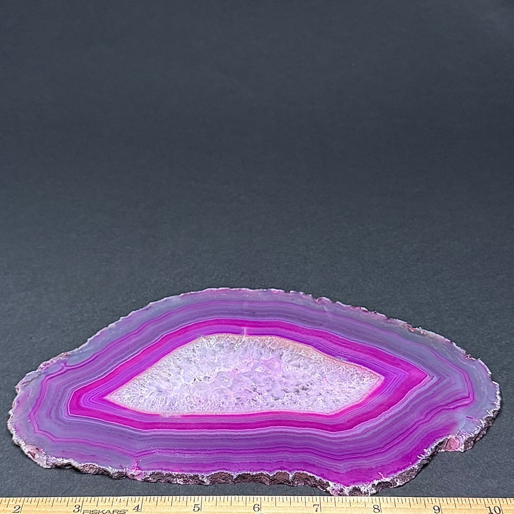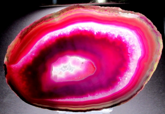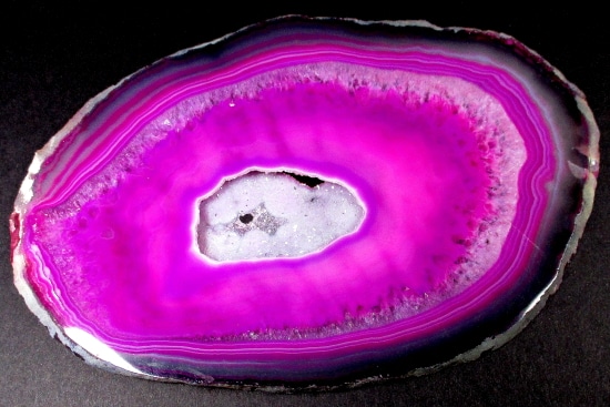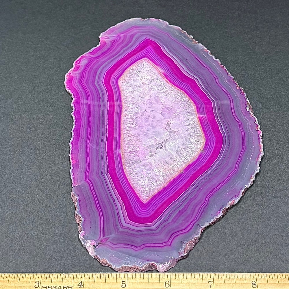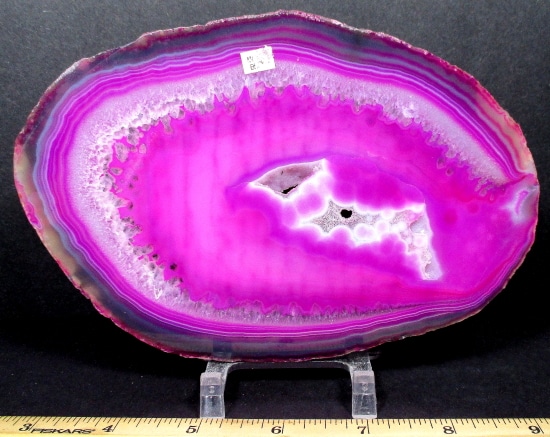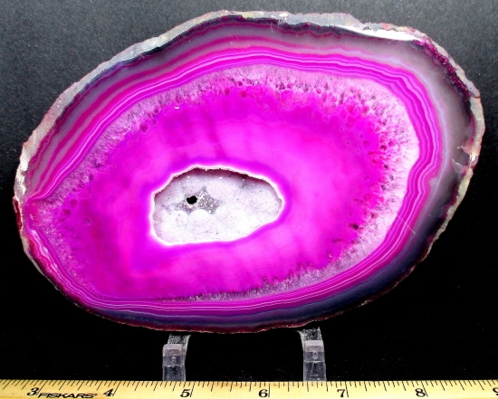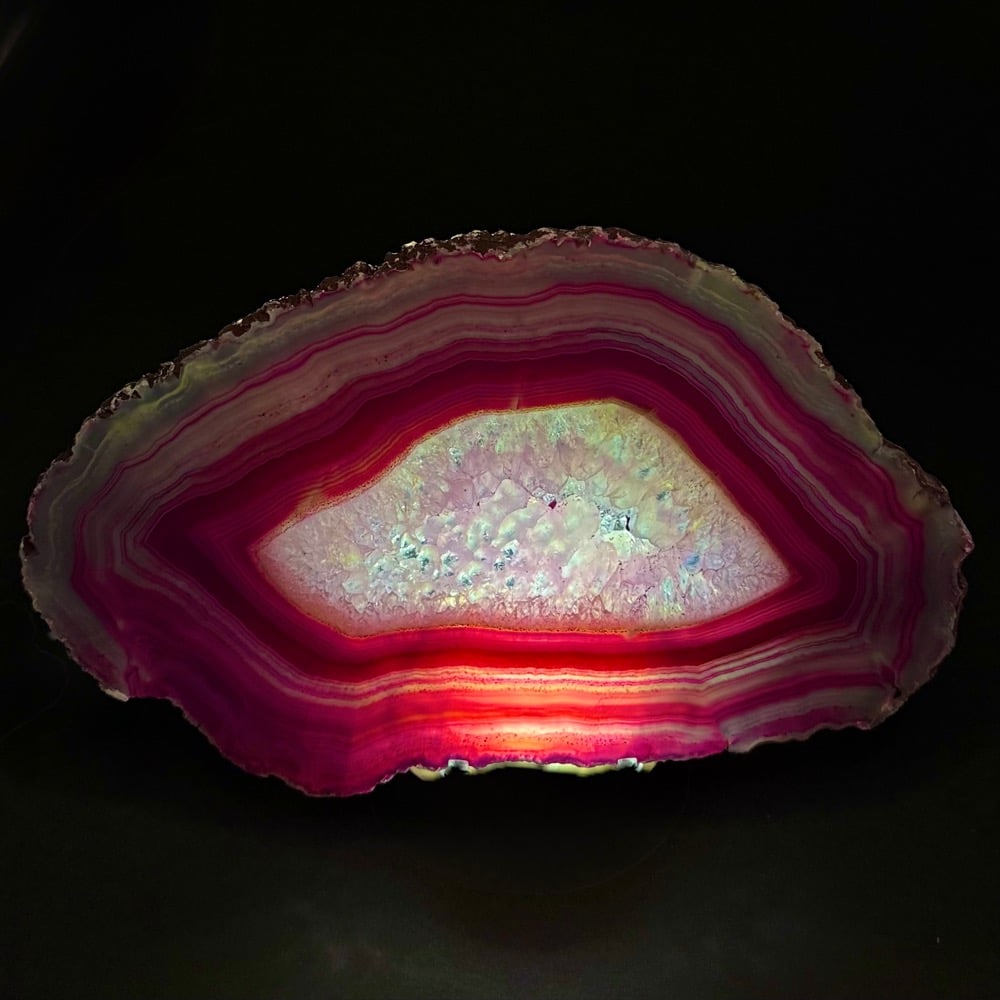 Appearance: Pink (color enhanced) Agate banding and lots of sparkly crystal. Translucent.