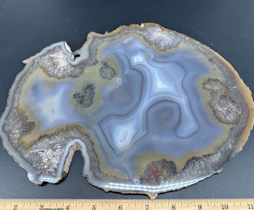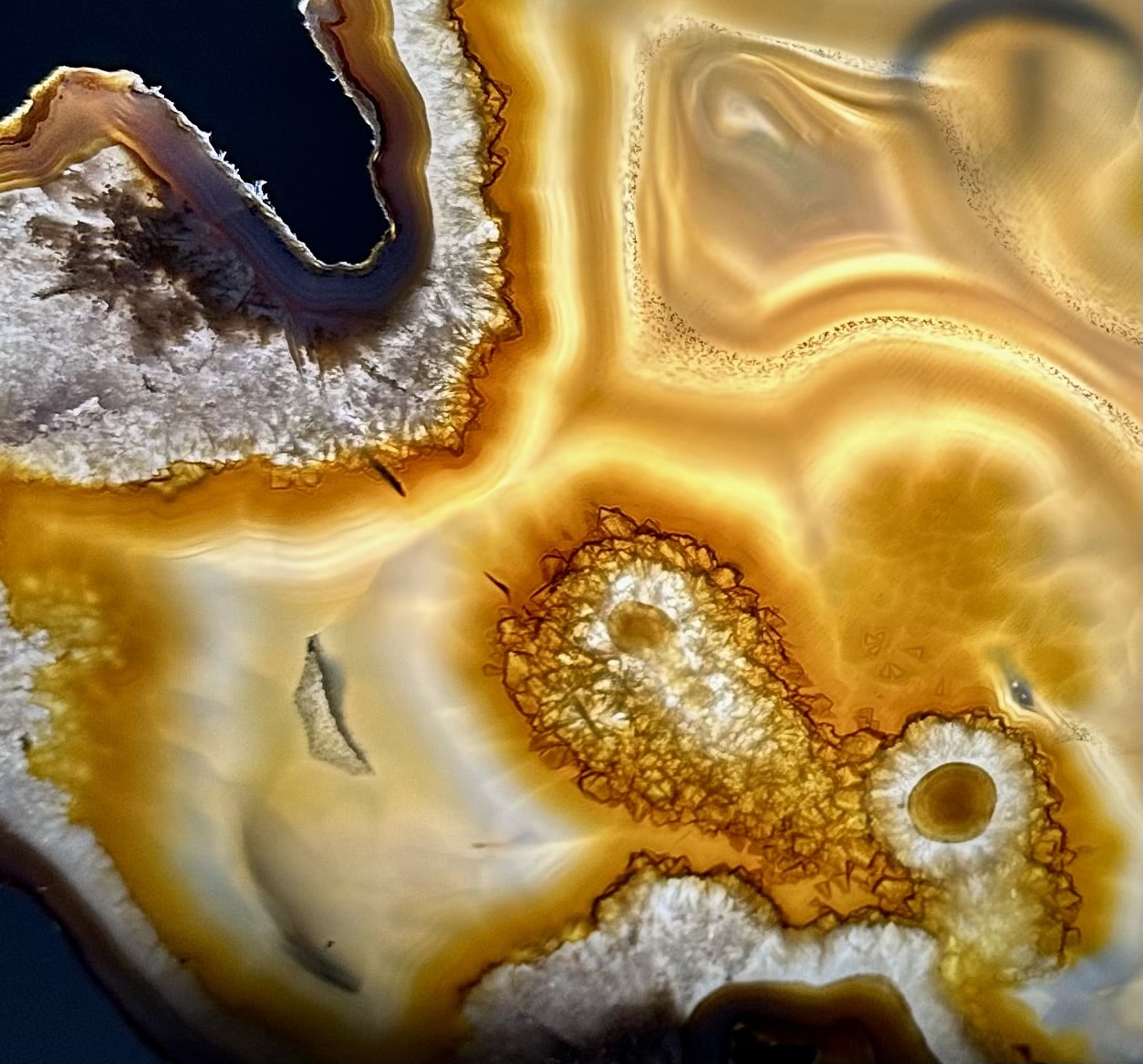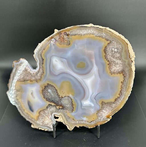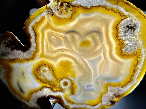 Agates mostly occur as nodules in volcanic rocks or waters containing silica in solution possibly derived from the decomposition of silicates in the lava. The siliceous matter is deposited in regular layers resulting in the banded or striped formation.