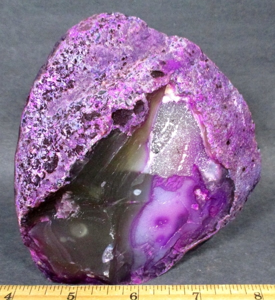 Geodes are geological rock formations which occur in sedimentary and certain volcanic rocks. They are essentially rock cavities, or vugs, with internal Crystal formations or concentric banding. The exterior is generally Limestone while the interior contains Quartz Crystals and/or Chalcedony deposits. If the Geode is completely filled with Crystal, being solid all the way through, it is then called a nodule.