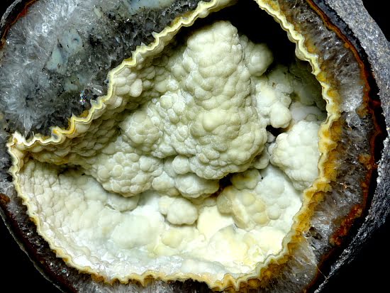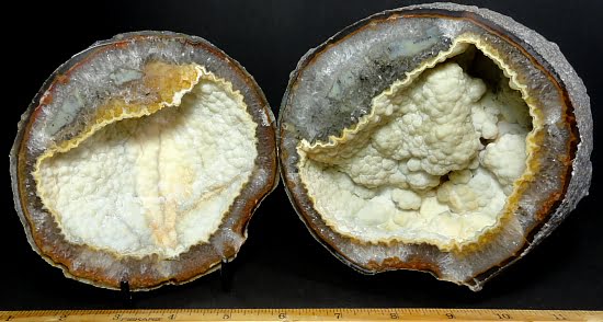 Geodes are geological rock formations which occur in sedimentary and certain volcanic rocks. They are essentially rock cavities, or vugs, with internal Crystal formations or concentric banding. The exterior is generally Limestone while the interior contains Quartz Crystals and/or Chalcedony deposits. If the Geode is completely filled with Crystal, being solid all the way through, it is then called a nodule.