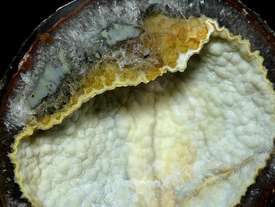 Agates mostly occur as nodules in volcanic rocks or waters containing silica in solution possibly derived from the decomposition of silicates in the lava. The siliceous matter is deposited in regular layers resulting in the banded or striped formation.