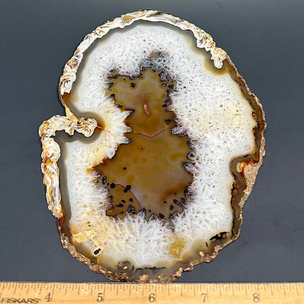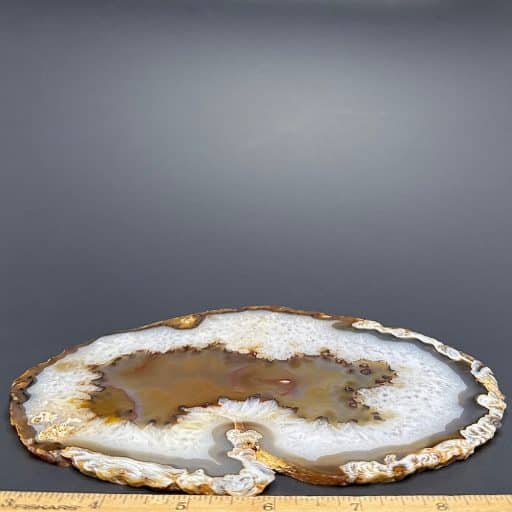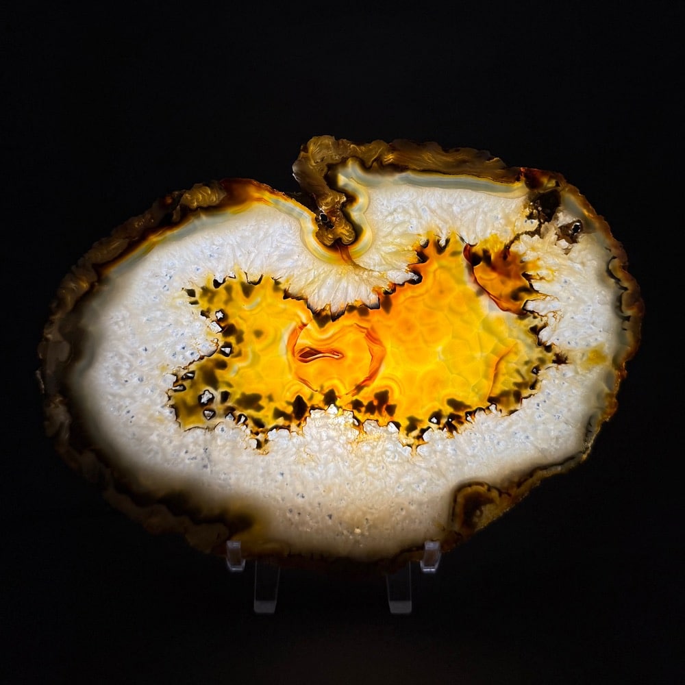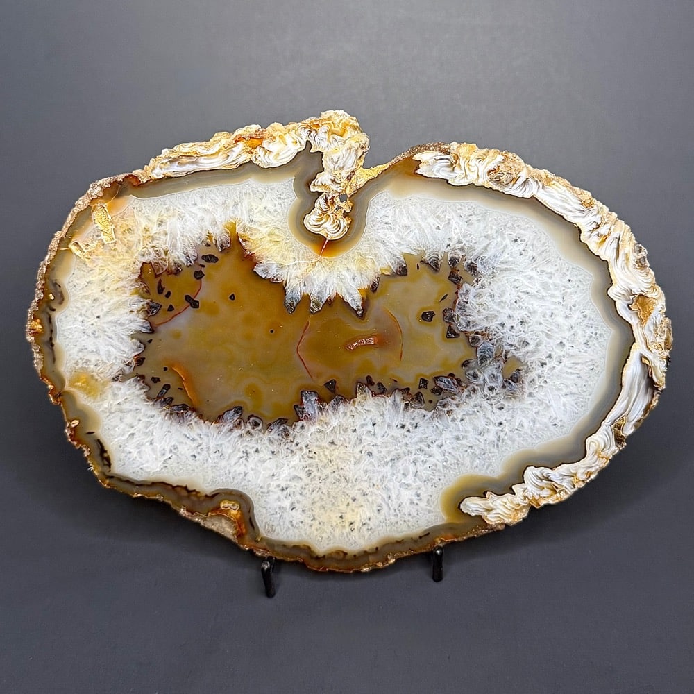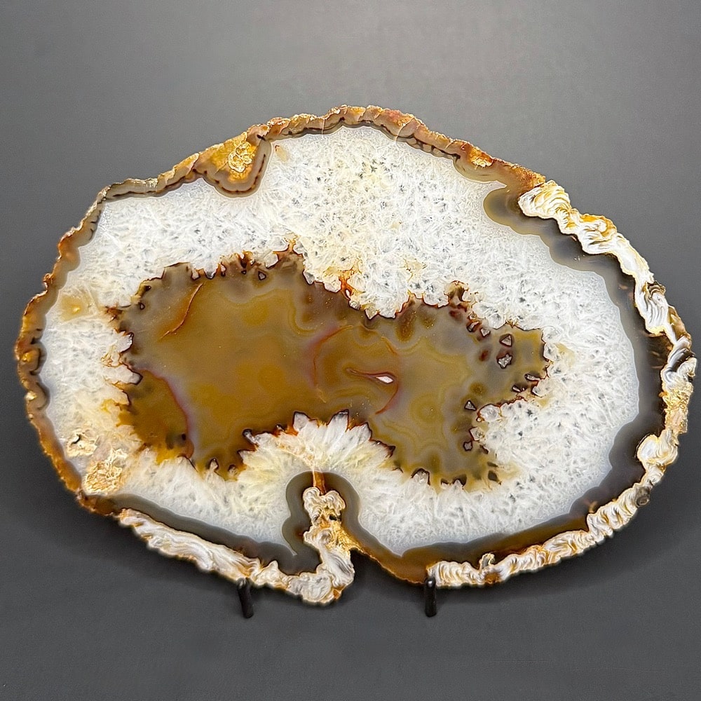 Agates mostly occur as nodules in volcanic rocks or waters containing silica in solution possibly derived from the decomposition of silicates in the lava. The siliceous matter is deposited in regular layers resulting in the banded or striped formation.