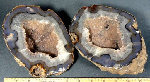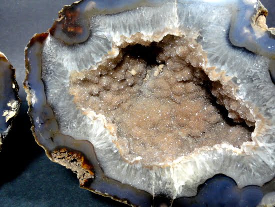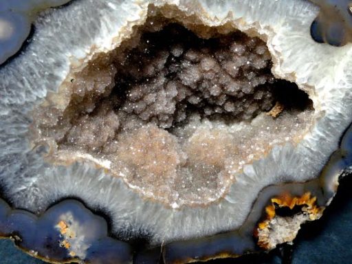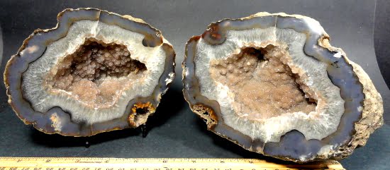Geodes are geological rock formations which occur in sedimentary and certain volcanic rocks. They are essentially rock cavities, or vugs, with internal Crystal formations or concentric banding. The exterior is generally Limestone while the interior contains Quartz Crystals and/or Chalcedony deposits. If the Geode is completely filled with Crystal, being solid all the way through, it is then called a nodule.