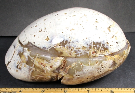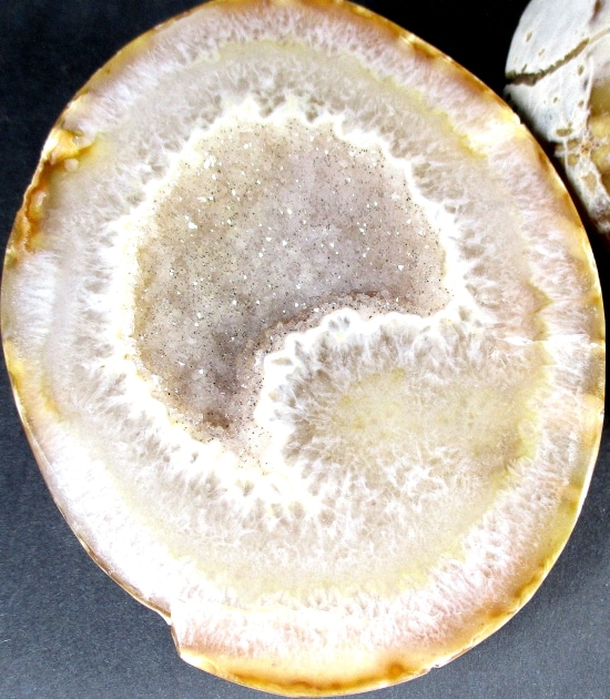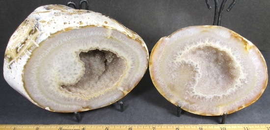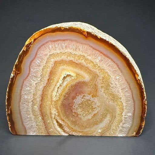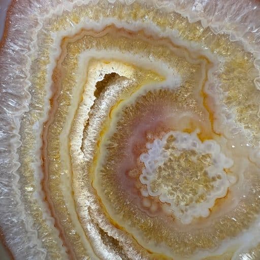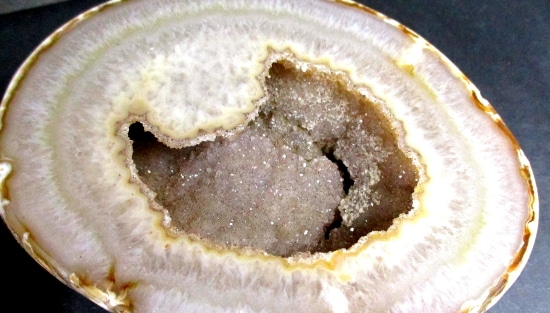 Agates mostly occur as nodules in volcanic rocks or waters containing silica in solution possibly derived from the decomposition of silicates in the lava.  The siliceous matter is deposited in regular layers resulting in the banded or striped formation.