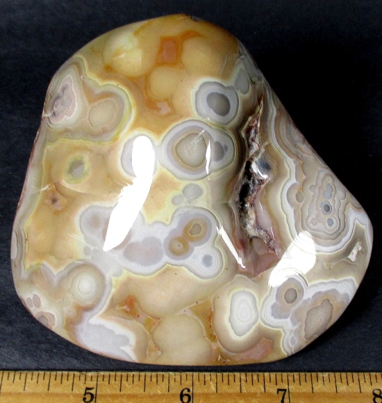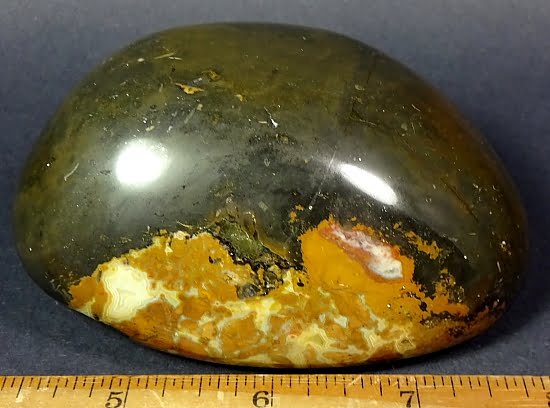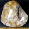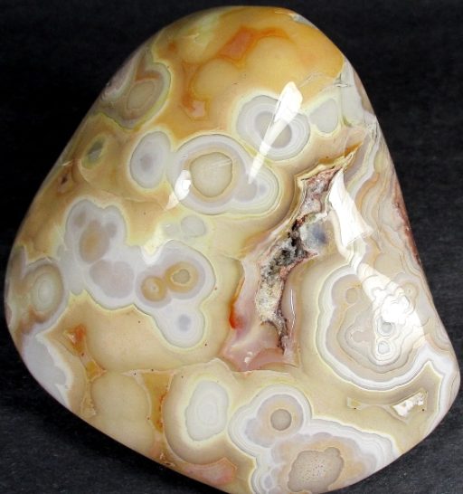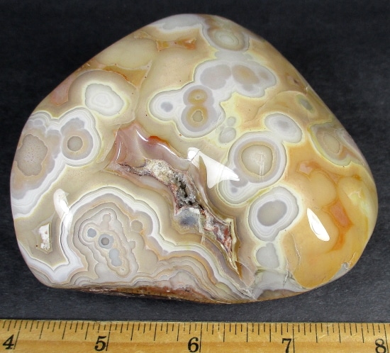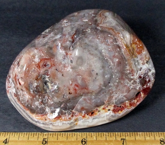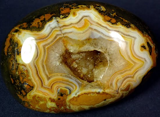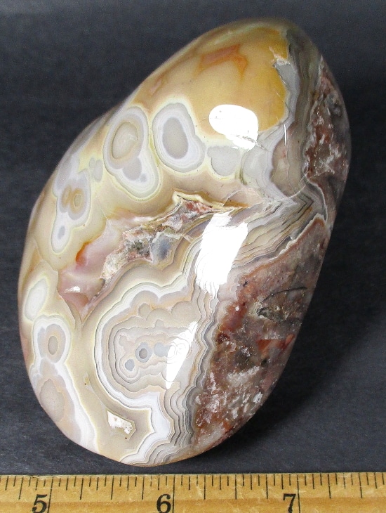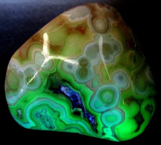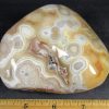 Here is an exceptional Mexican Lace Agate from an unknown location in Mexico. This beauty has a unique design and appearance in the different colors and the excellent lace banding ranging from white and cream to various grays and browns with different accents in the banding.  It measures 3 3/4″ x 2 1/2″ x 3 1/4″and has a great polish. This amazing rock will fluoresce a gorgeous green and blue under a UV/SW light as seen in the last photo.