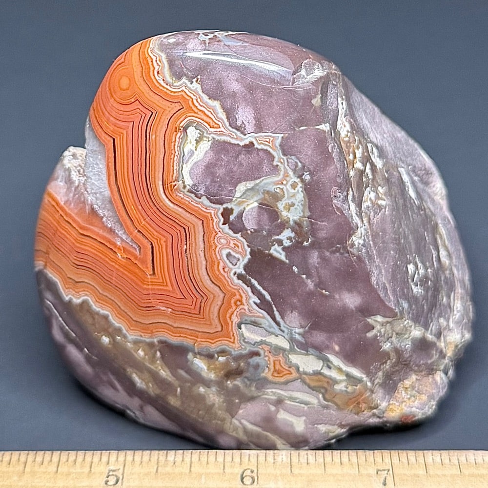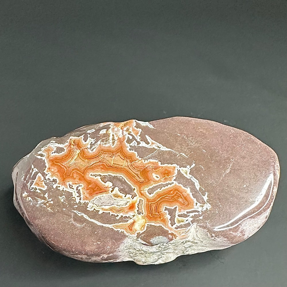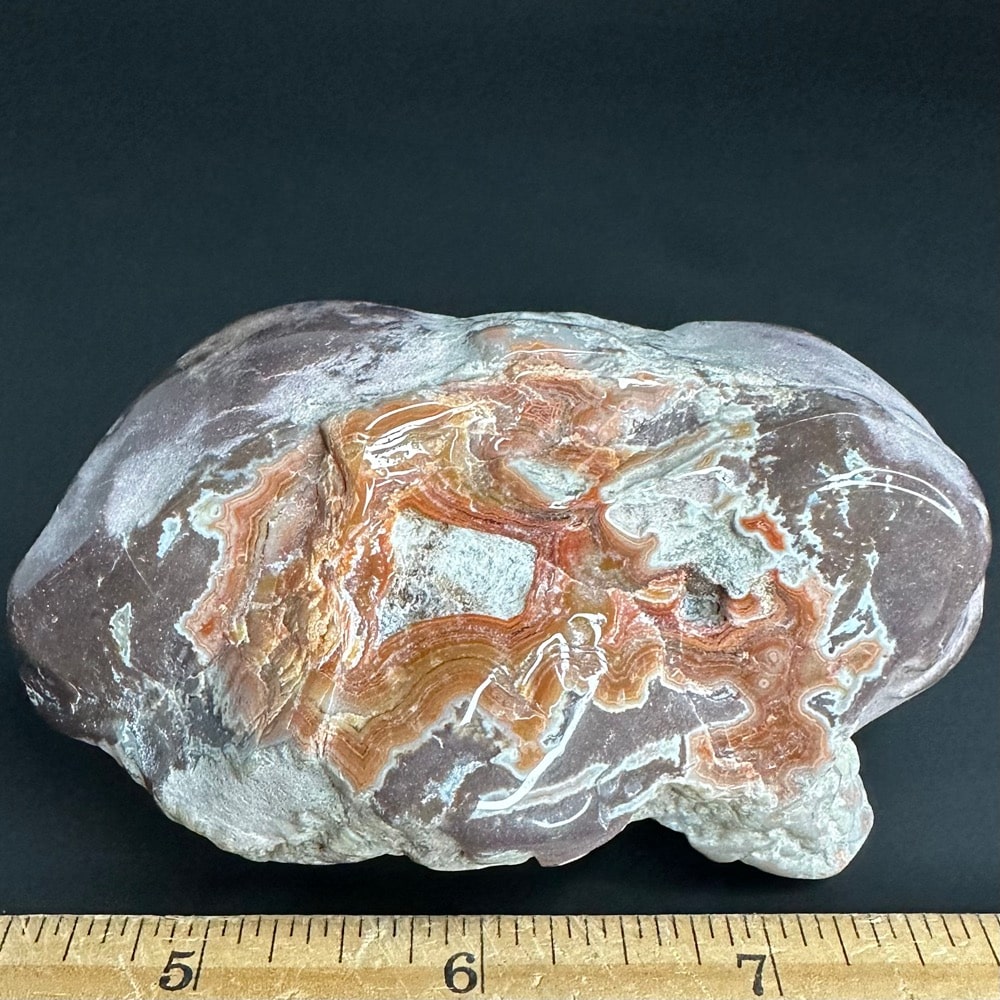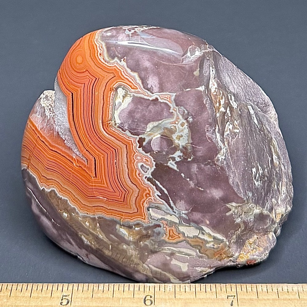 Dry Head Agates are from the Bighorn Canyon area of Montana. The banding colors are usually bright orange with some white or pink bands on charcoal, light gray, whitish oranges or greenish matrix. Dry Head Agates are very rare and no longer available as the mining area is now part of a wild horse refuge. Dry Head Agates may be geologically similar to the Teepee Canyon and Fairburn Agates of the Black Hills area.