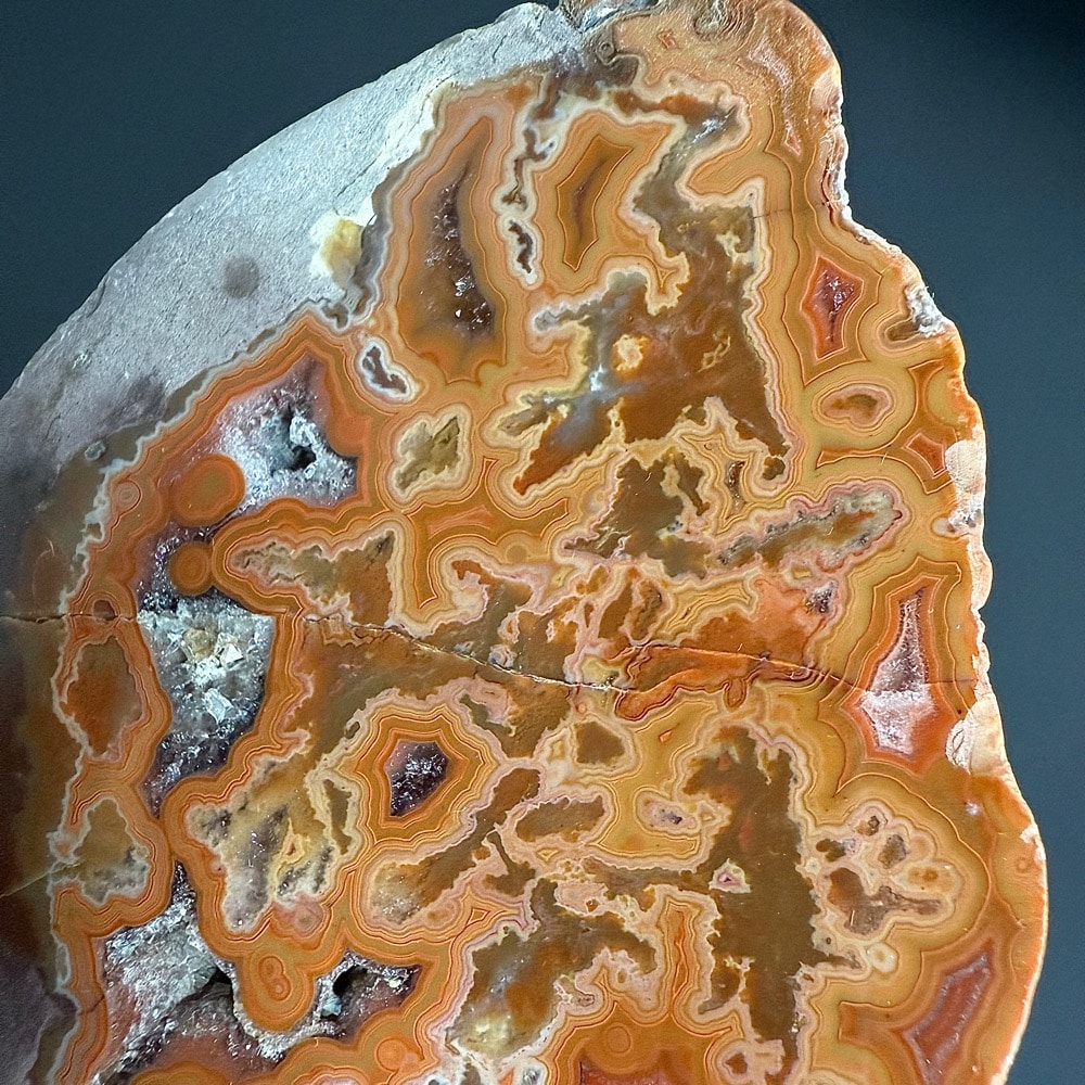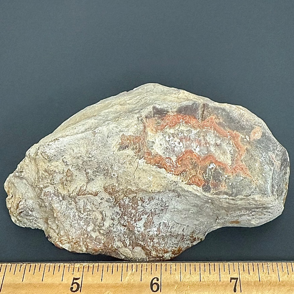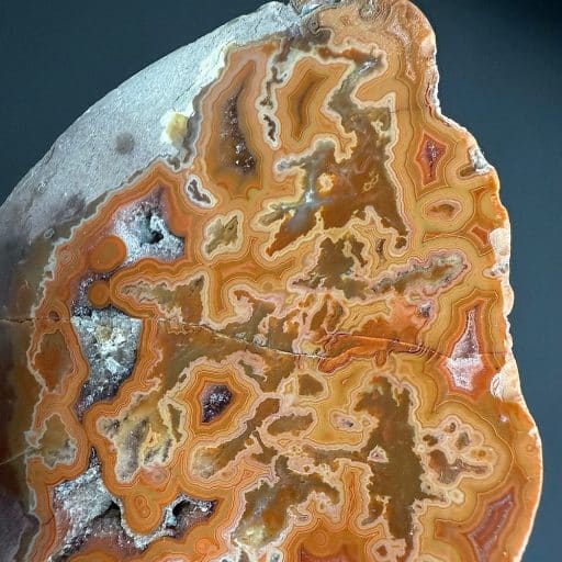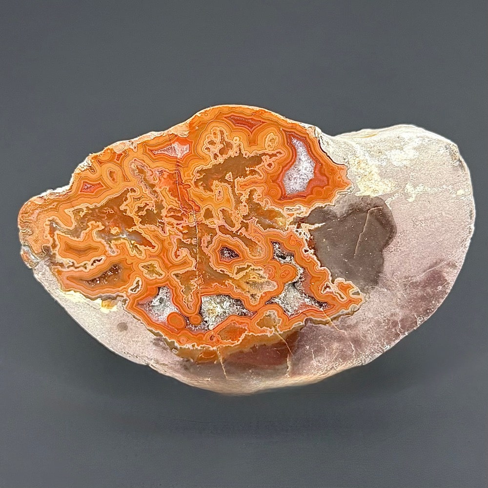 Dry Head Agates are from the Bighorn Canyon area of Montana.  The banding colors are usually bright orange with some white or pink bands on charcoal, light gray, whitish oranges or greenish matrix.  Dry Head Agates are very rare and no longer available as the mining area is now part of a wild horse refuge.  Dry Head Agates may be geologically similar to the Teepee Canyon and Fairburn Agates of the Black Hills area.