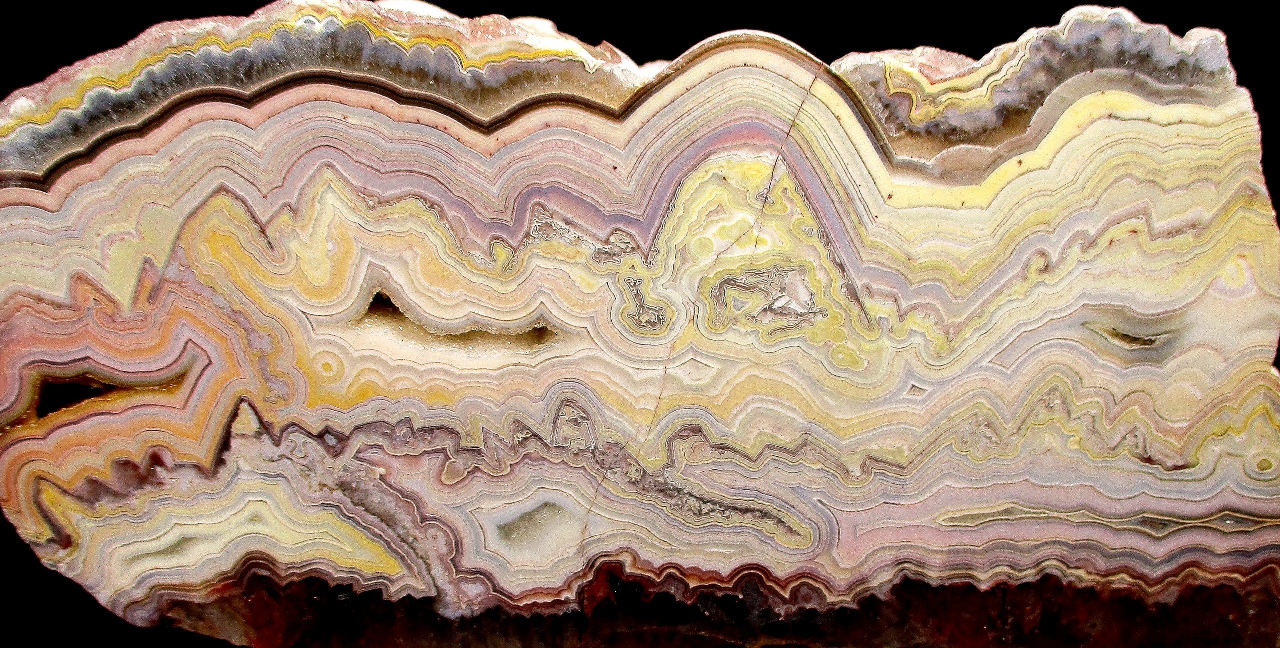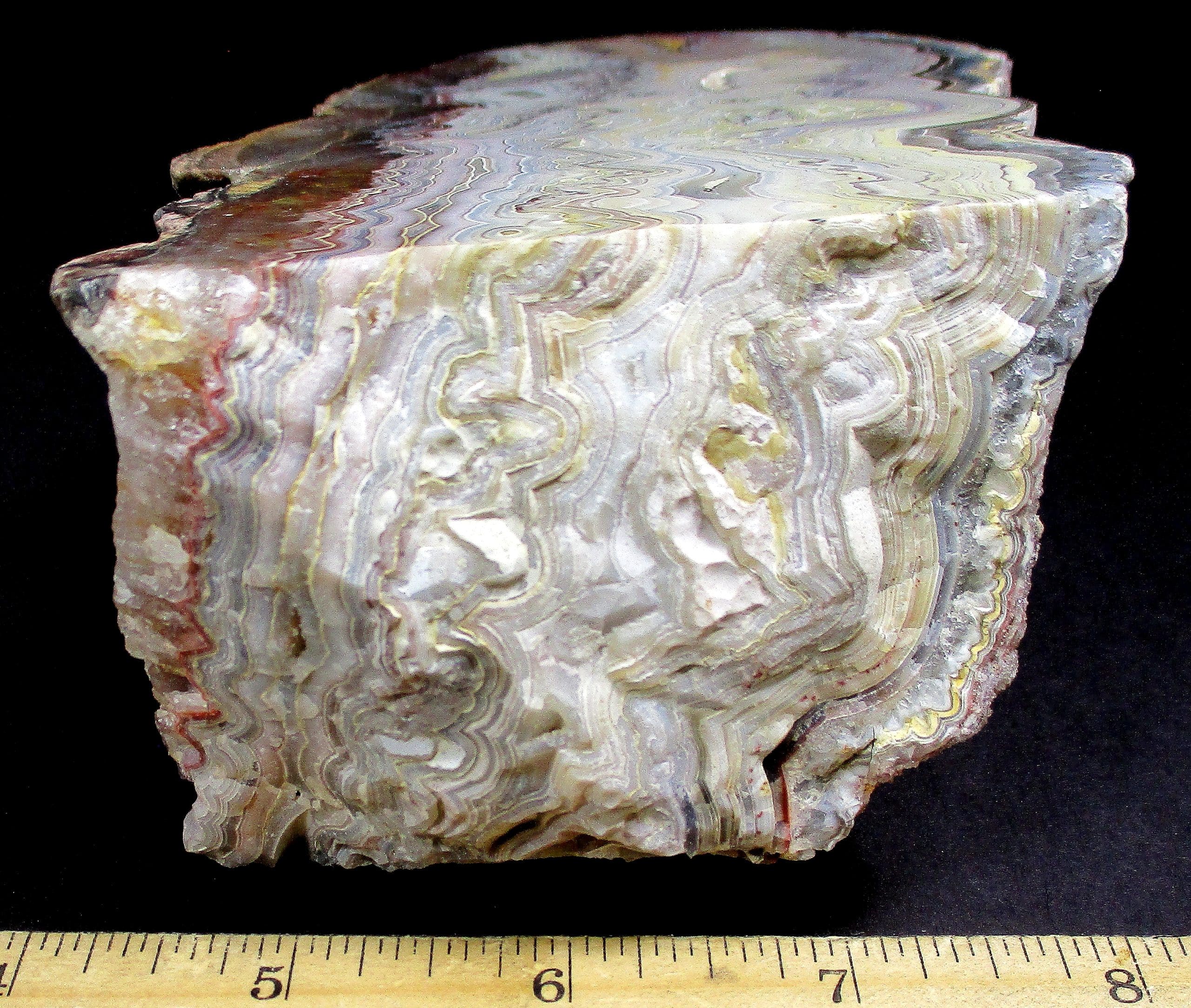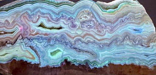 Among the best-known varieties of banded chalcedony is the stone often known as Mexican Crazy Lace Agate. The hardness of the material makes it a joy to cut, while the intricate patterns have made it a favorite since the 1950s. This unique agate forms into many different patterns in many colors, but the stones generally have a common “theme.”