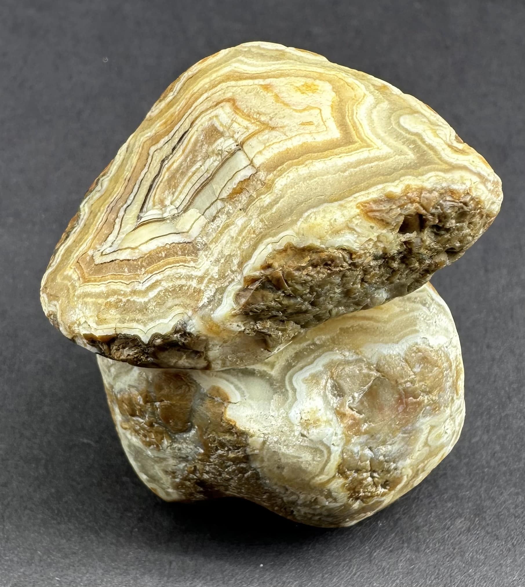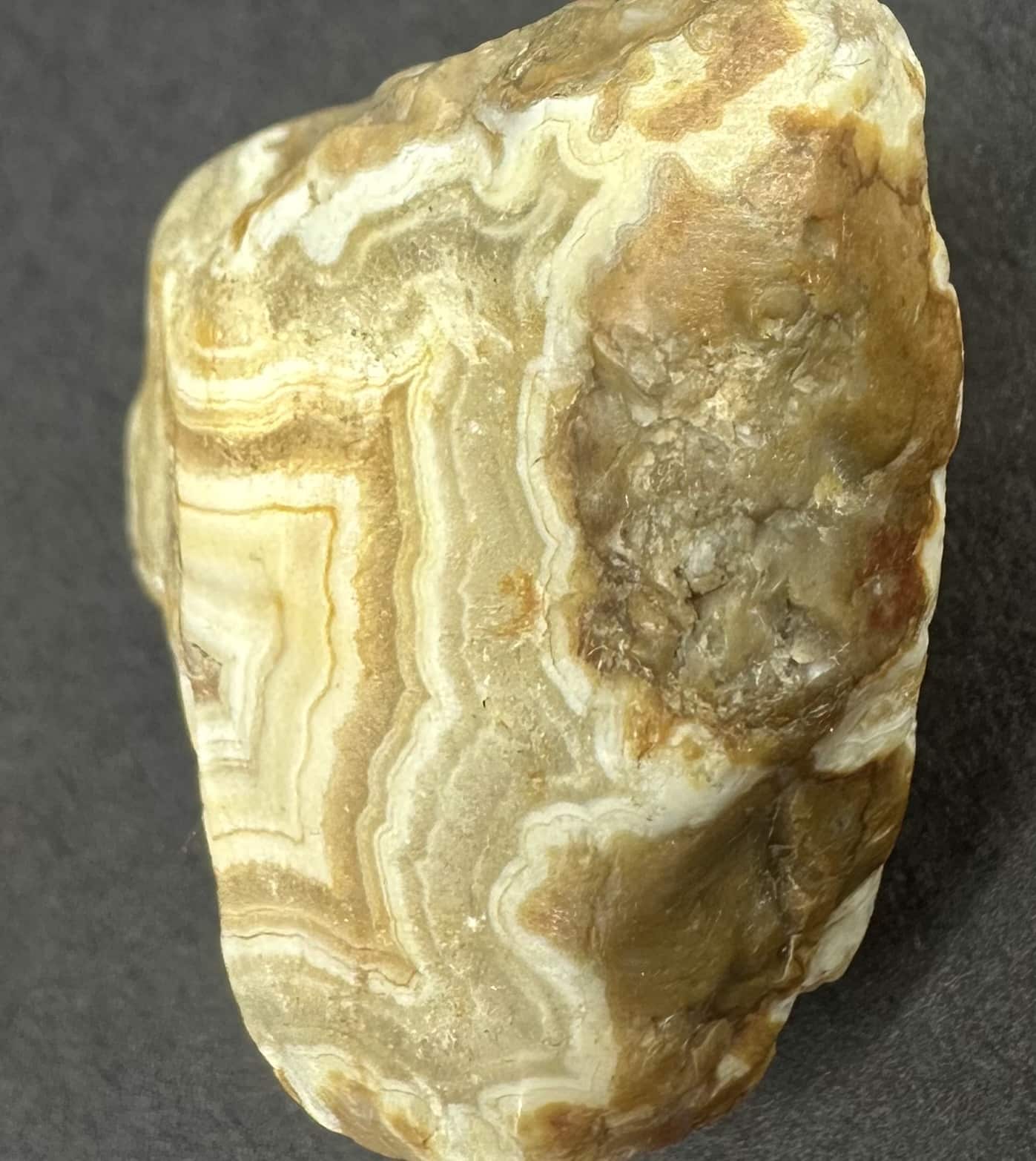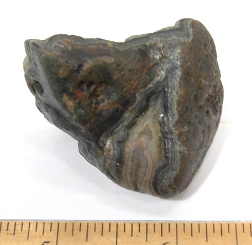 Colors found in the bands are created by trace amounts of minerals such as iron oxide, hematite, goethite, magnetite, and other oxidated minerals. These materials mixed with the silica and were included in the crystallization during formation, giving the layers of cryptocrystalline quartz their color.