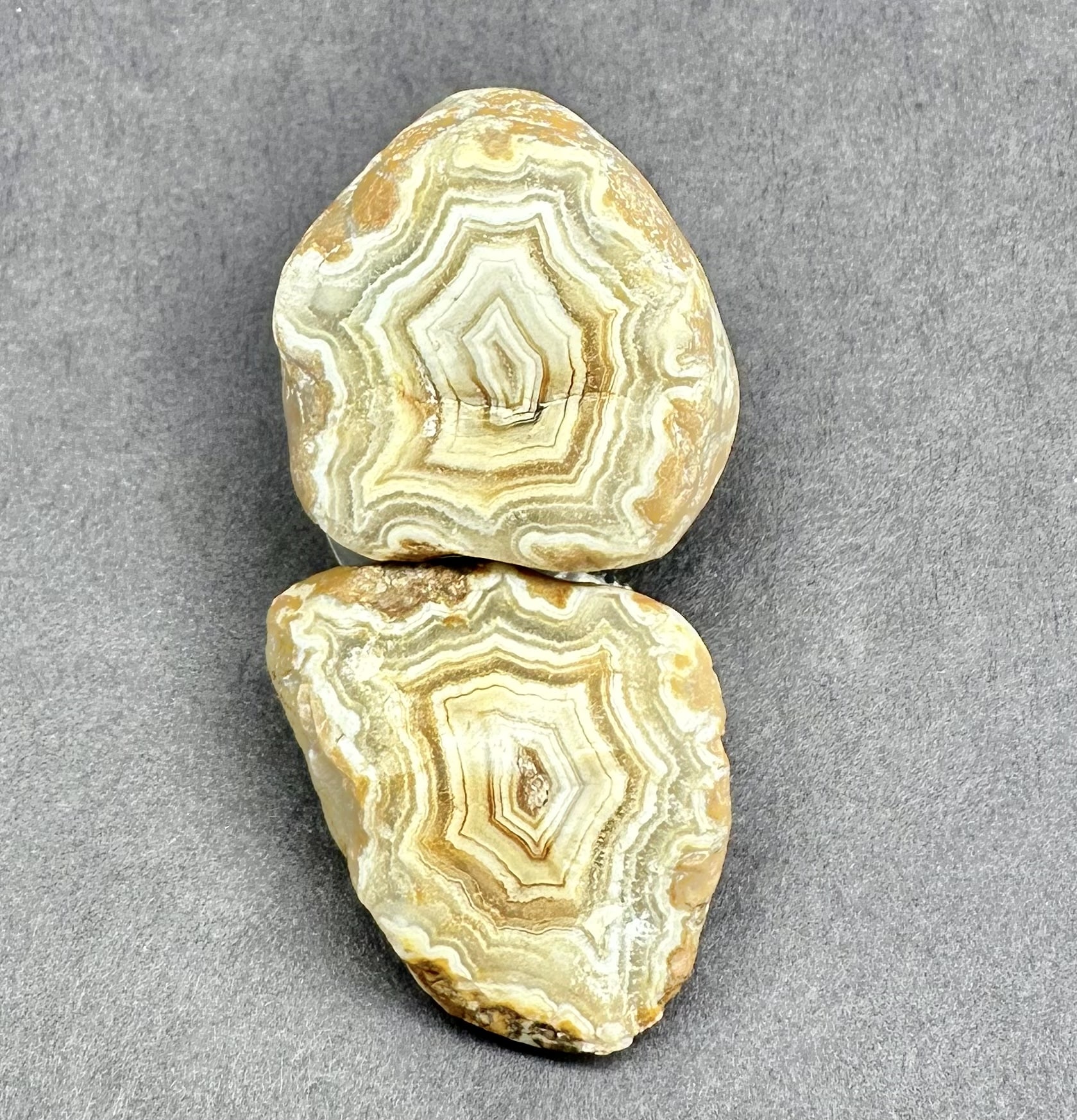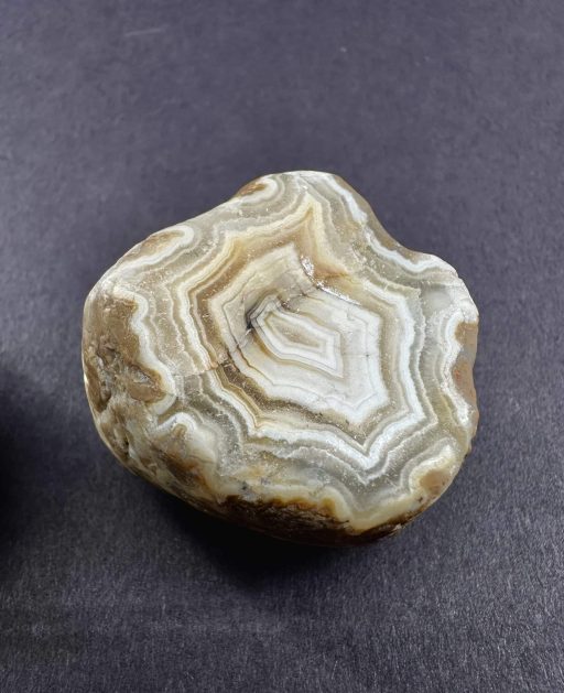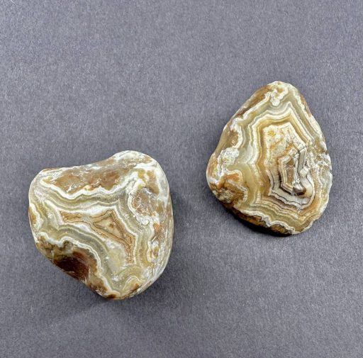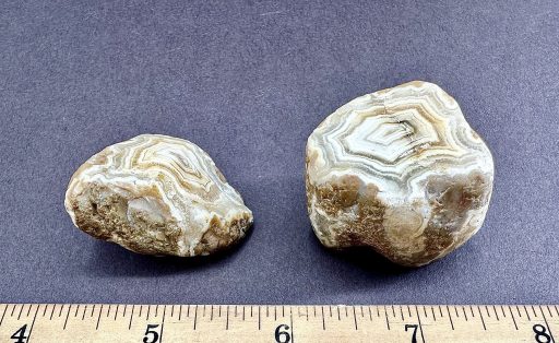 Agates mostly occur as nodules in volcanic rocks or waters containing Silica in solution which is possibly derived from the decomposition of Silicates in the lava. The Siliceous matter is deposited in regular layers resulting in the banded or striped formation. It is very unlikely that you would ever find an exact duplicate of any type of Agate.