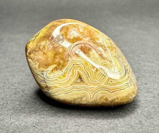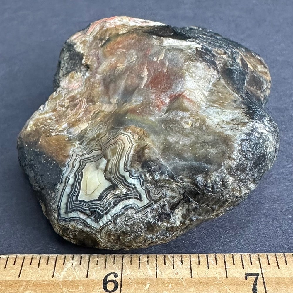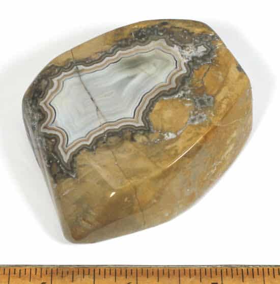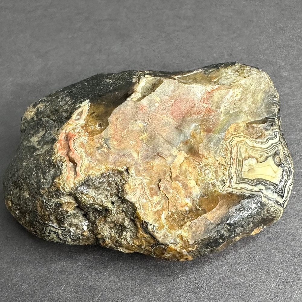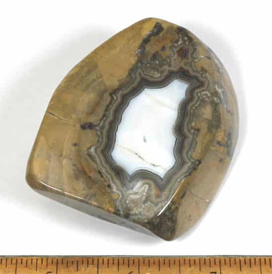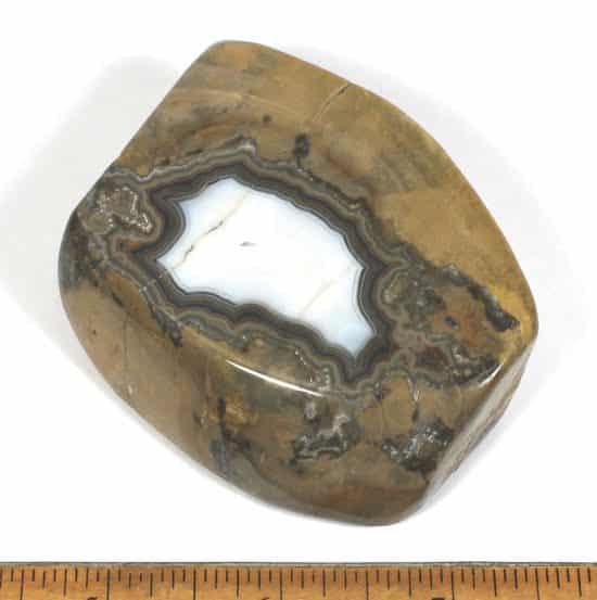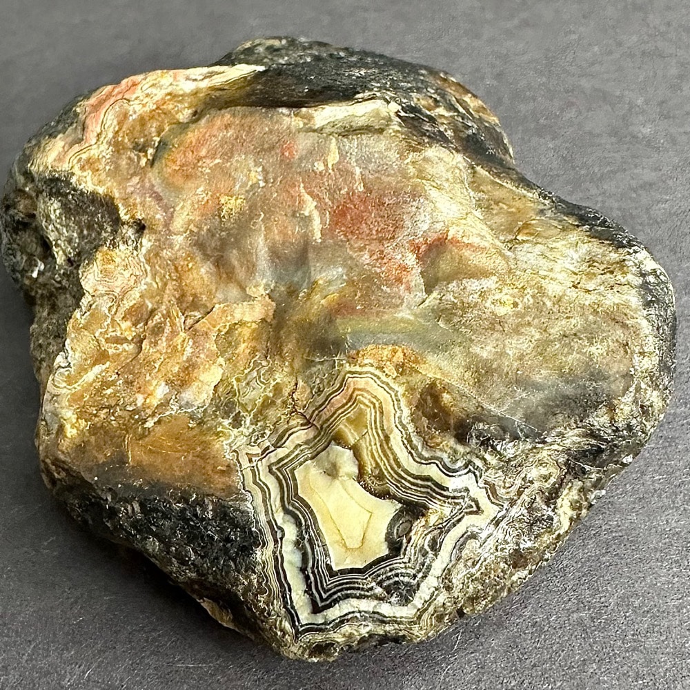 Colors found in the bands are created by trace amounts of minerals such as iron oxide, hematite, goethite, magnetite, and other oxidated minerals. These materials mixed with the silica and were included in the crystallization during formation, giving the layers of cryptocrystalline quartz their color.
