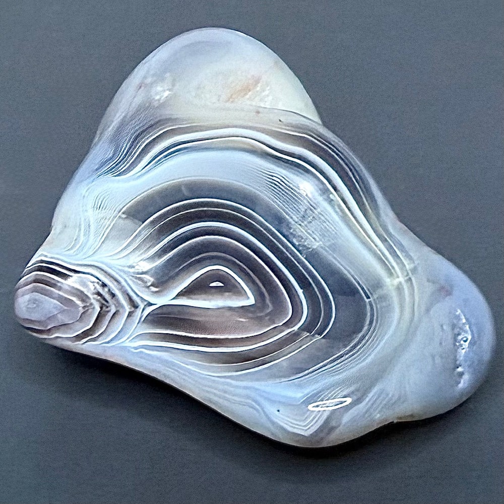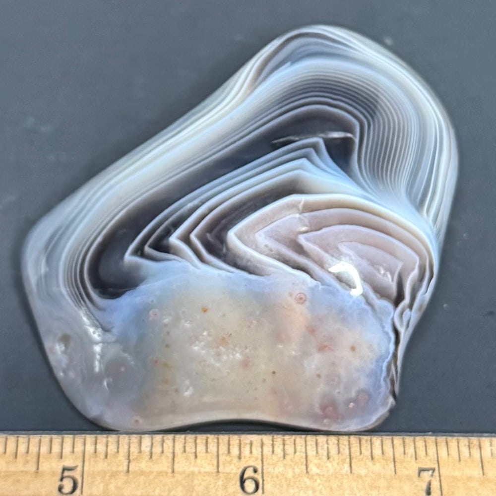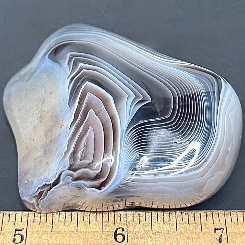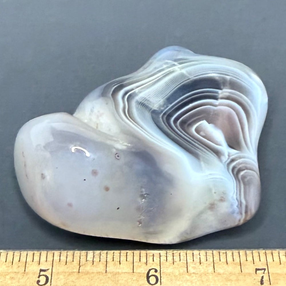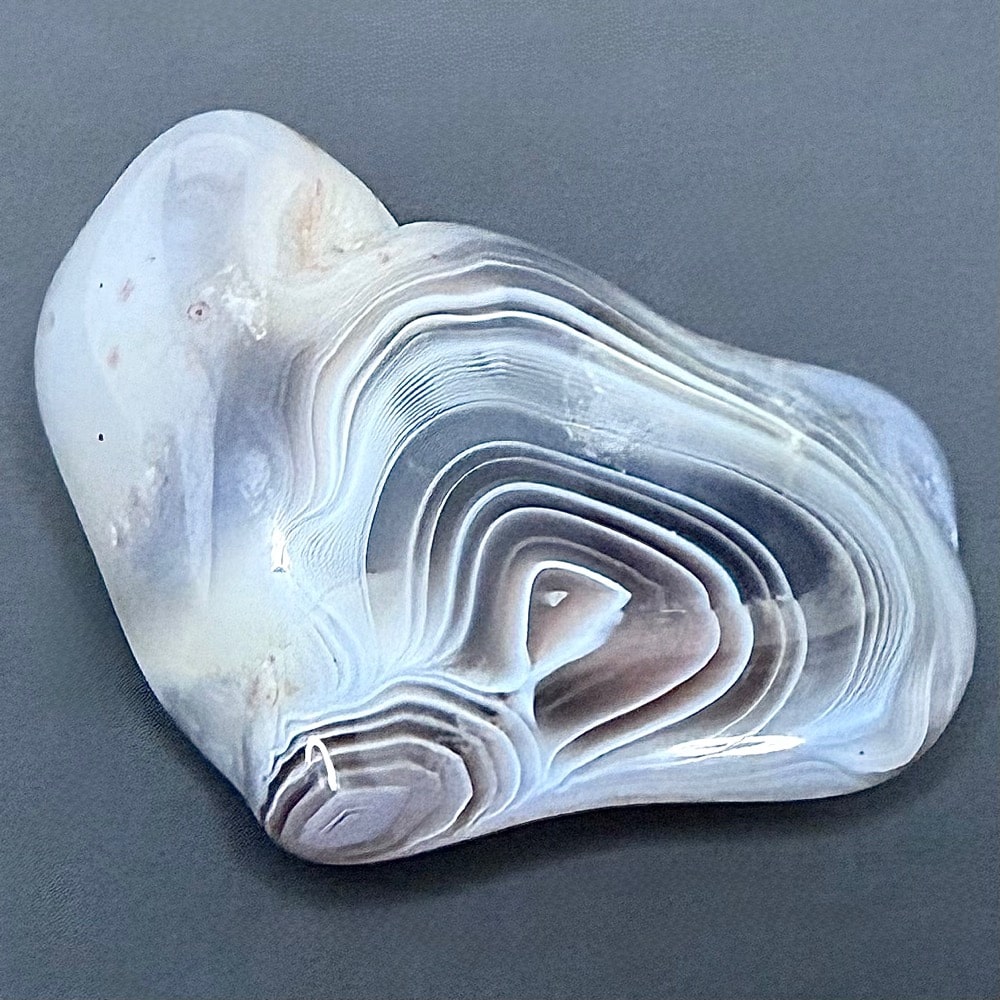 Appearance: The Botswana Agate is a type of banded Chalcedony, a mineral of the Quartz family with striped banding and was cut and polished right here in our Lapidary Department.