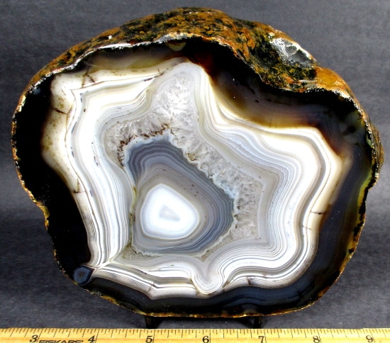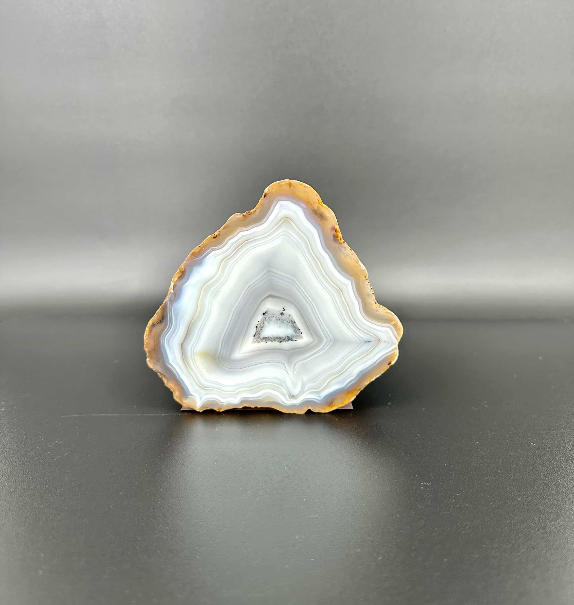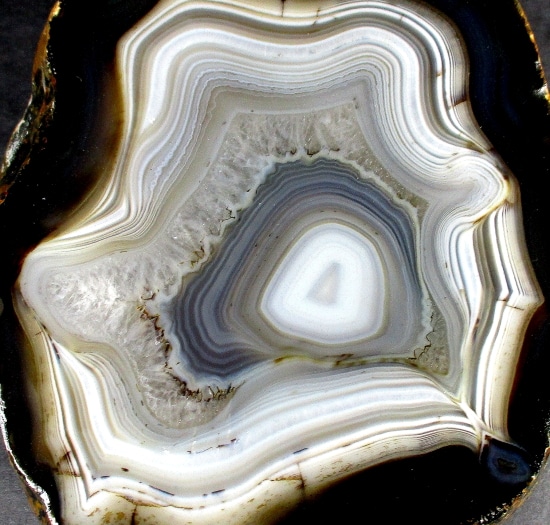 Agates mostly occur as nodules in volcanic rocks or waters containing Silica in solution which is possibly derived from the decomposition of Silicates in the lava. The Siliceous matter is deposited in regular layers resulting in the banded or striped formation. It is very unlikely that you would ever find an exact duplicate of any type of Agate.