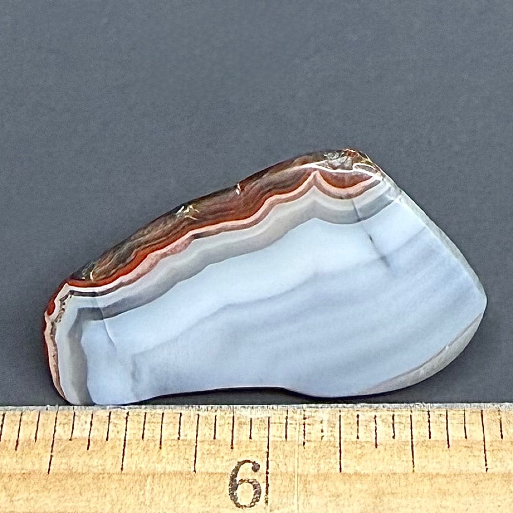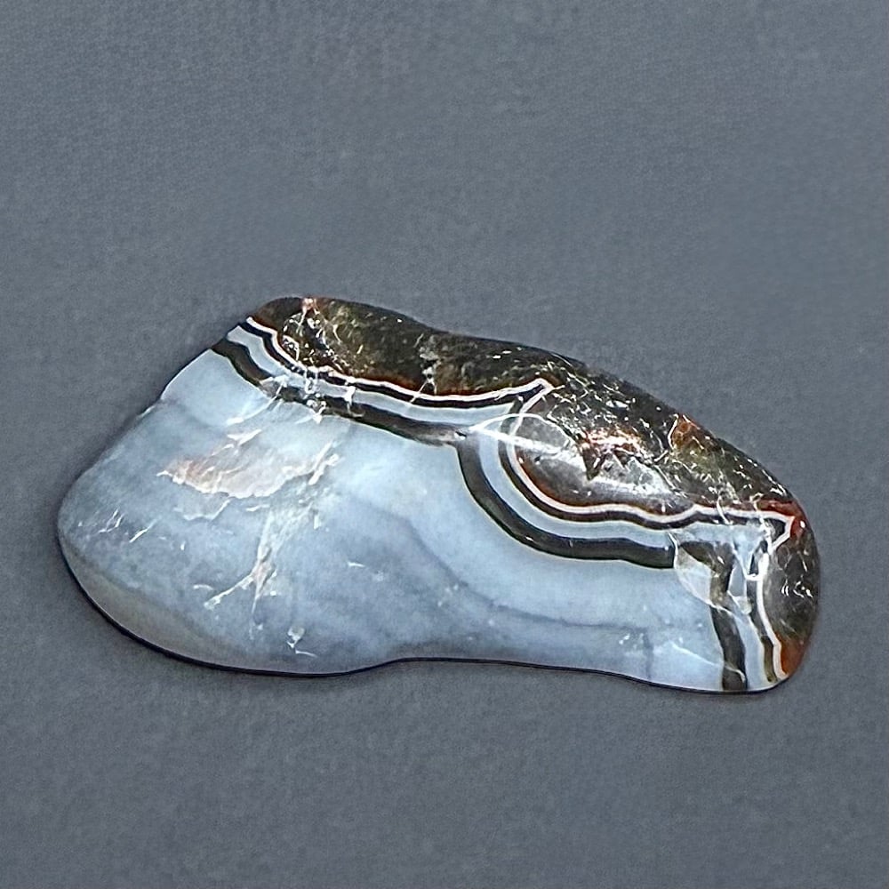 Colors found in the bands are created by trace amounts of minerals such as iron oxide, hematite, goethite, magnetite, and other oxidated minerals. These materials mixed with the silica and were included in the crystallization during formation, giving the layers of cryptocrystalline quartz their color.