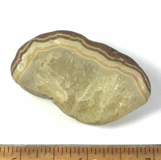 Colors found in the bands are created by trace amounts of minerals such as iron oxide, hematite, goethite, magnetite, and other oxidated minerals. These materials mixed with the silica and were included in the crystallization during formation, giving the layers of cryptocrystalline quartz their color.