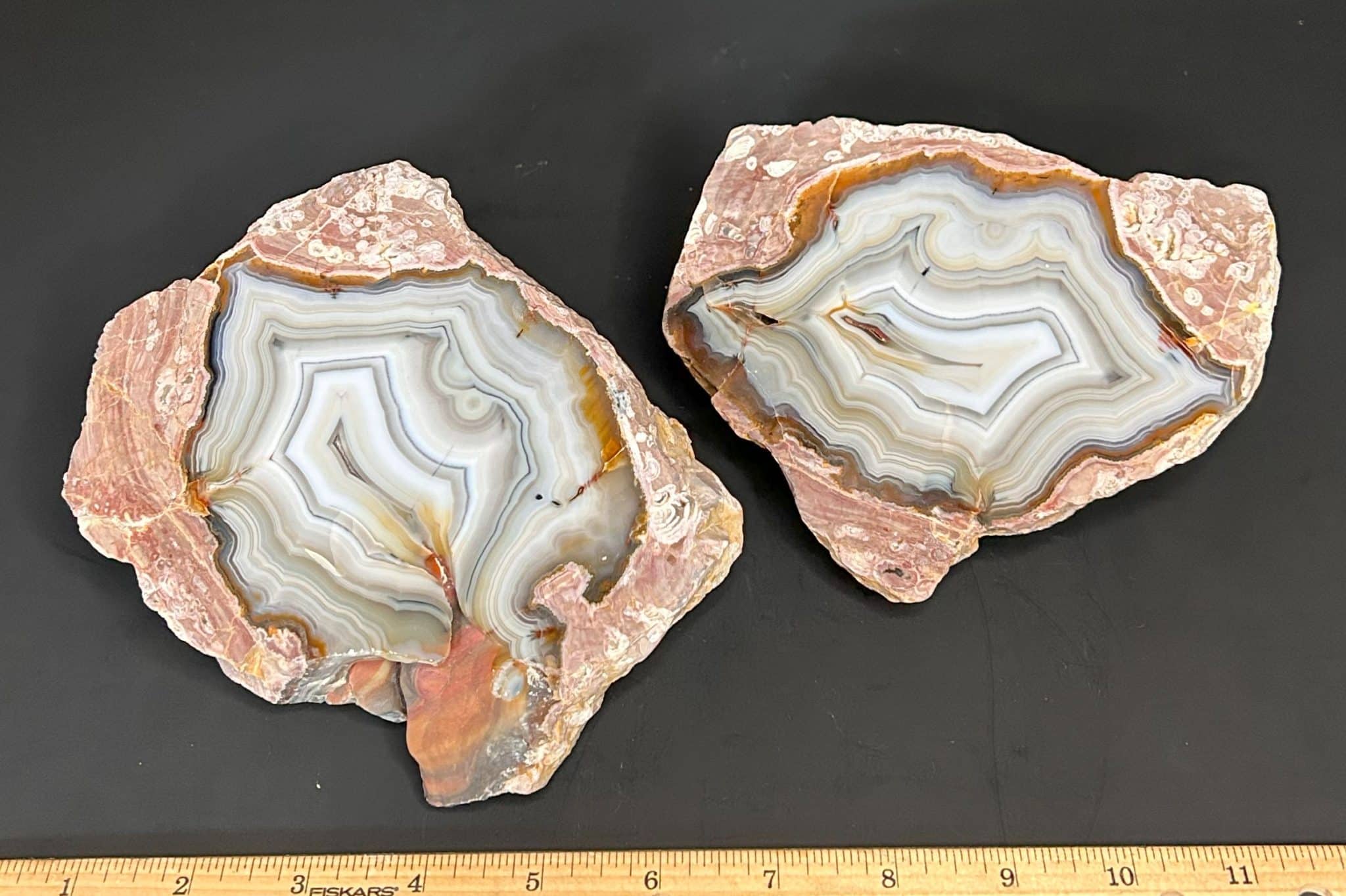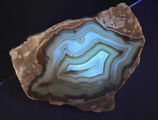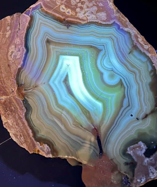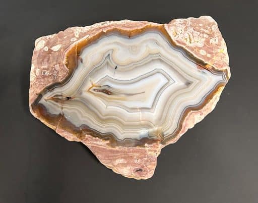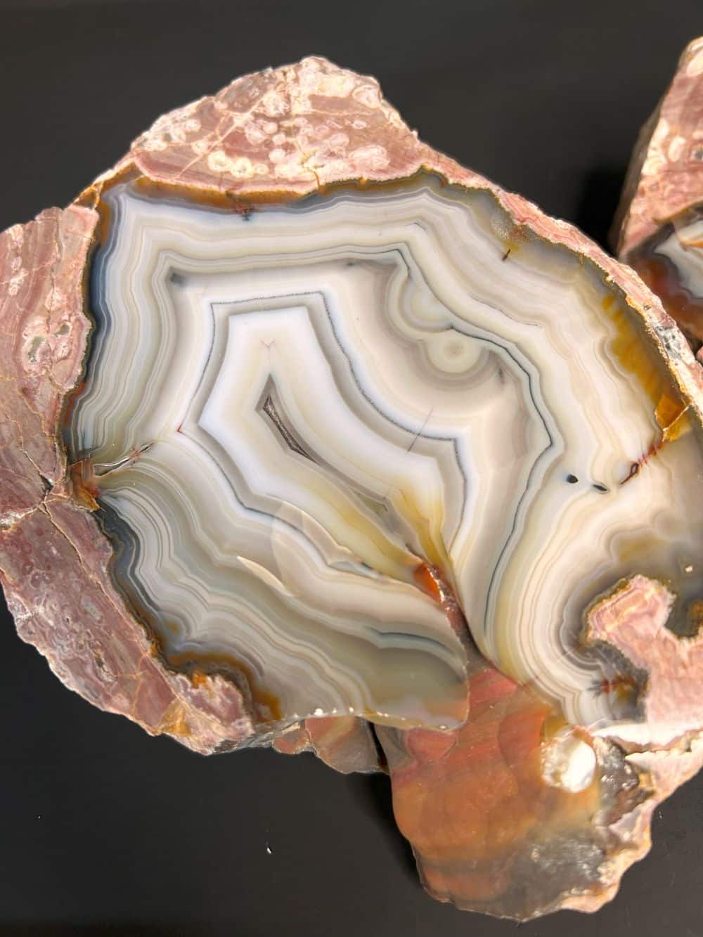 Banded agate in rhyolite, specifically from North Ankara, Turkey, is a unique geological find where the parent rock, rhyolite, features a finely arranged structure often resembling petrified wood, and contains swirling cores of multicolored banded agate.