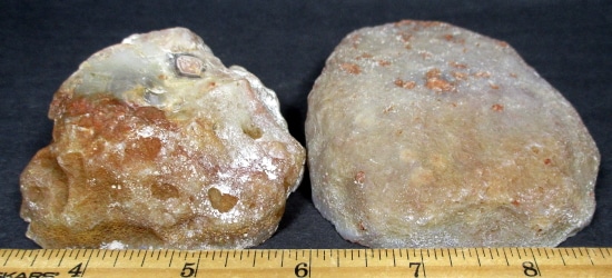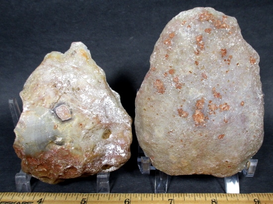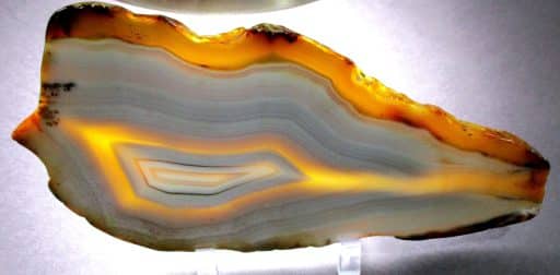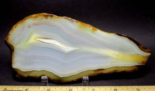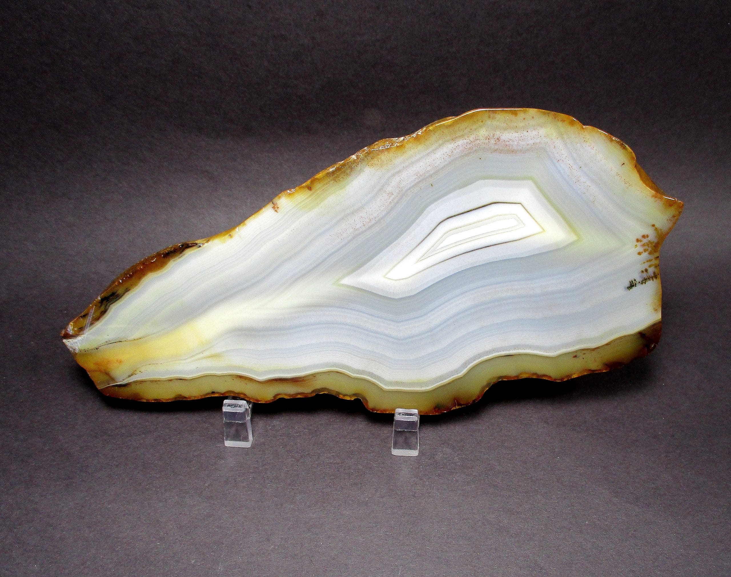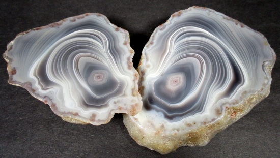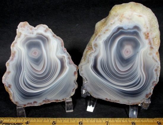 Agates mostly occur as nodules in volcanic rocks or waters containing Silica in solution which is possibly derived from the decomposition of Silicates in the lava. The Siliceous matter is deposited in regular layers resulting in the banded or striped formation. It is very unlikely that you would ever find an exact duplicate of any type of Agate.