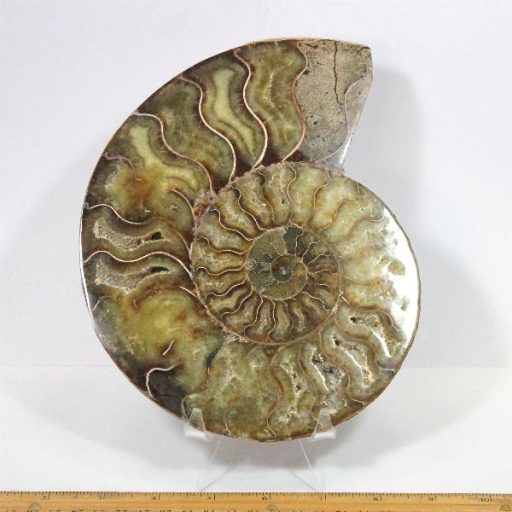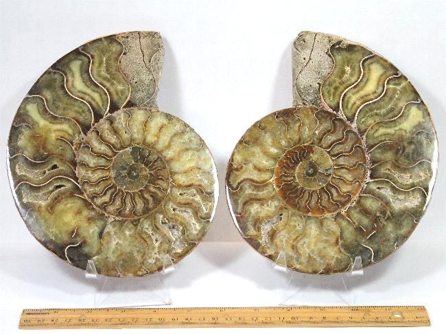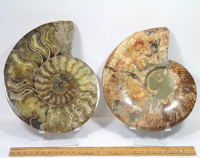 Here is a large, above average quality, colorful Ammonite set.  Each piece measures over 7 3/4″ x nearly 6 5/8″ x 7/8″ thick and has a nice polish on both sides.  The set has a highly detailed interior with some nice crystallized cavities.  This beautiful fossil is from Madagascar.  Very, very nice!