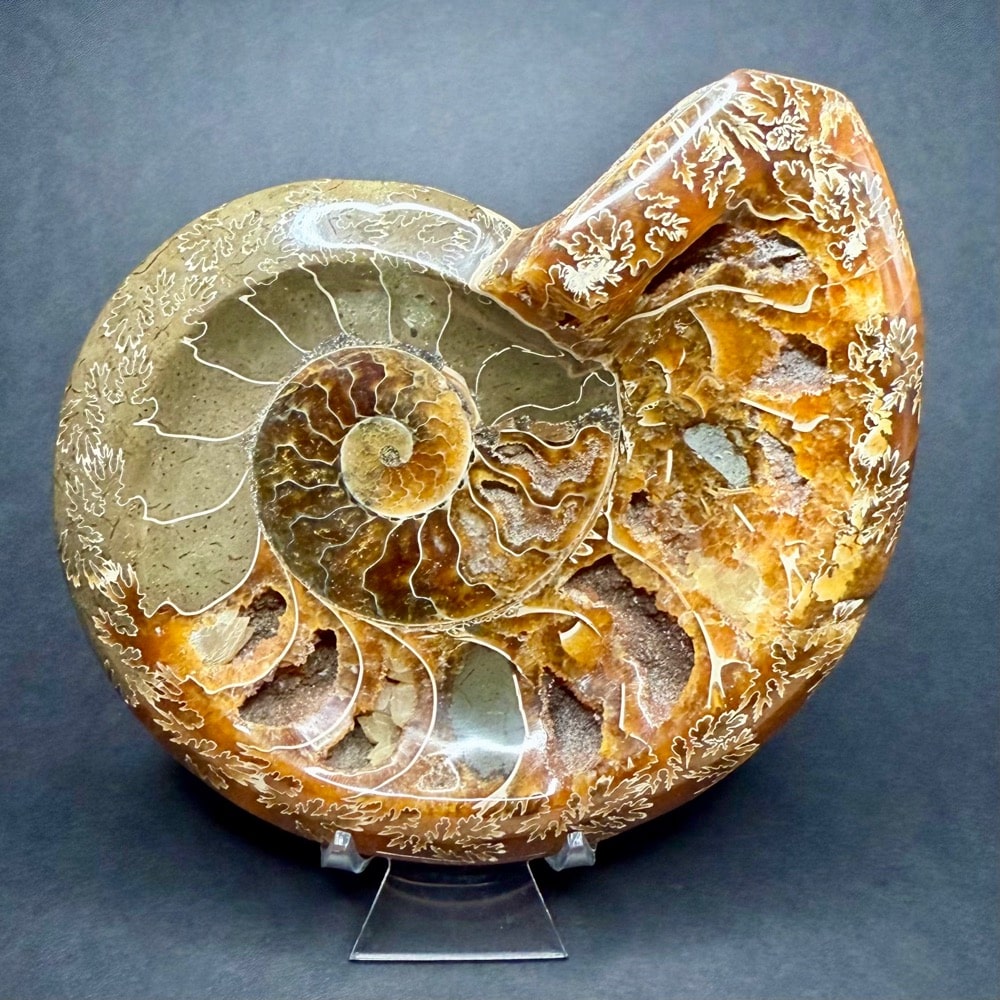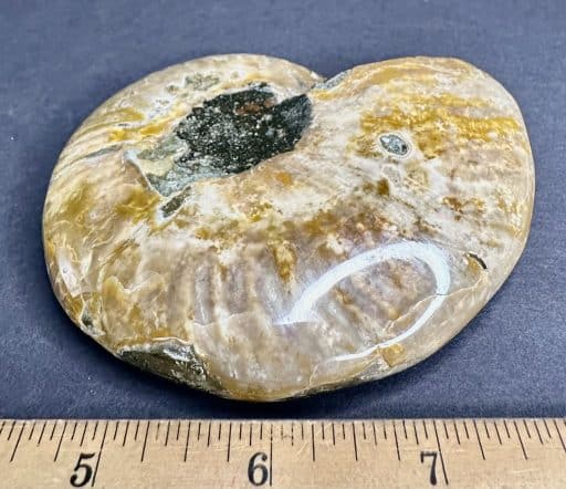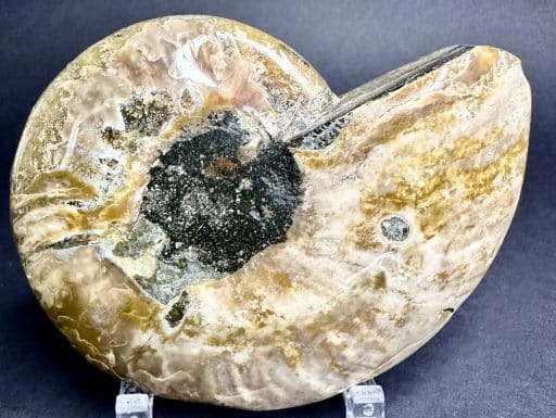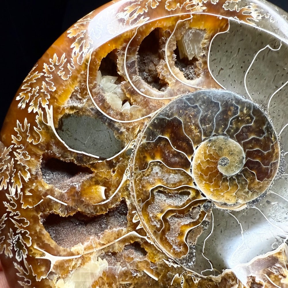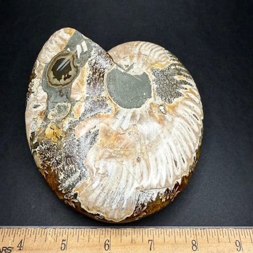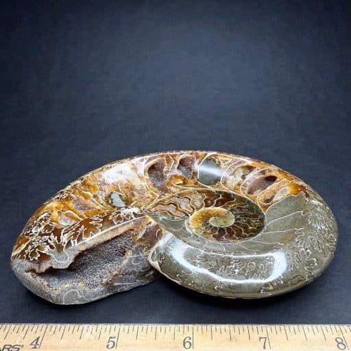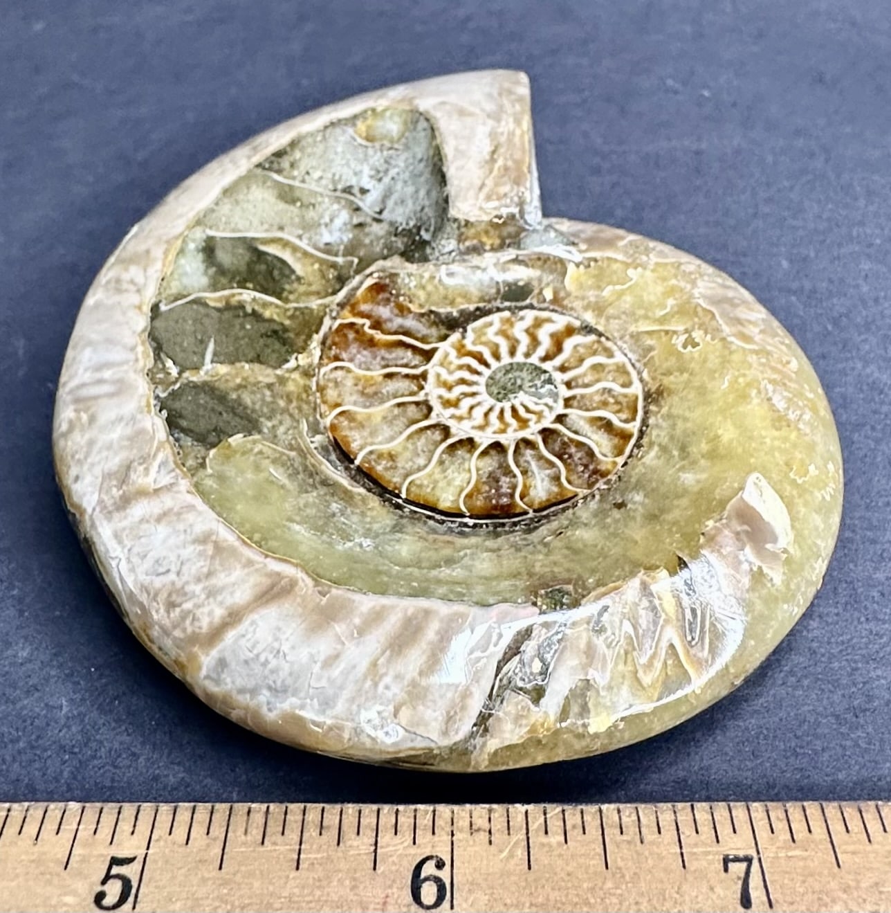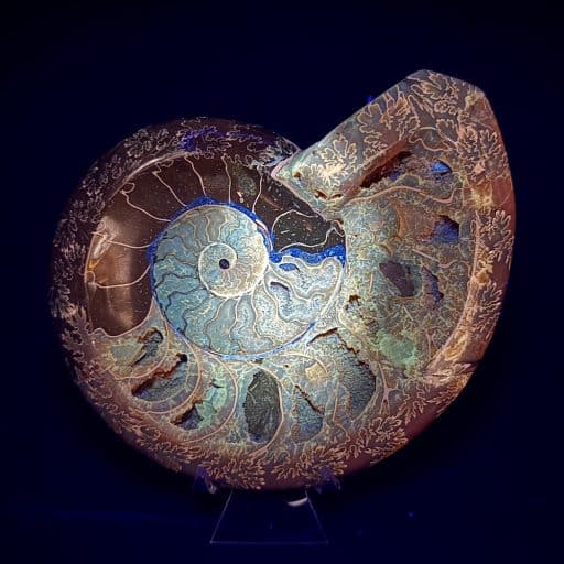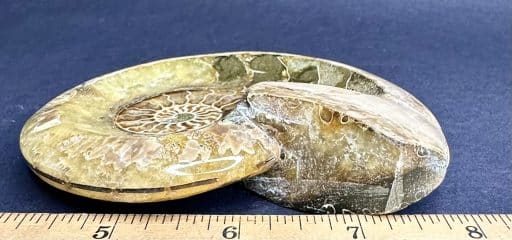 Ammonites are extinct members of the cephalopod group of mollusks. Only a limited number of species have survived to the present day which includes the squid and the chambered nautilus. Ammonites had a multi-chambered shell, and added more chambers as it grew, always living in the outer chamber. They lived in the Cretaceous period some 63 to 130 million years ago.