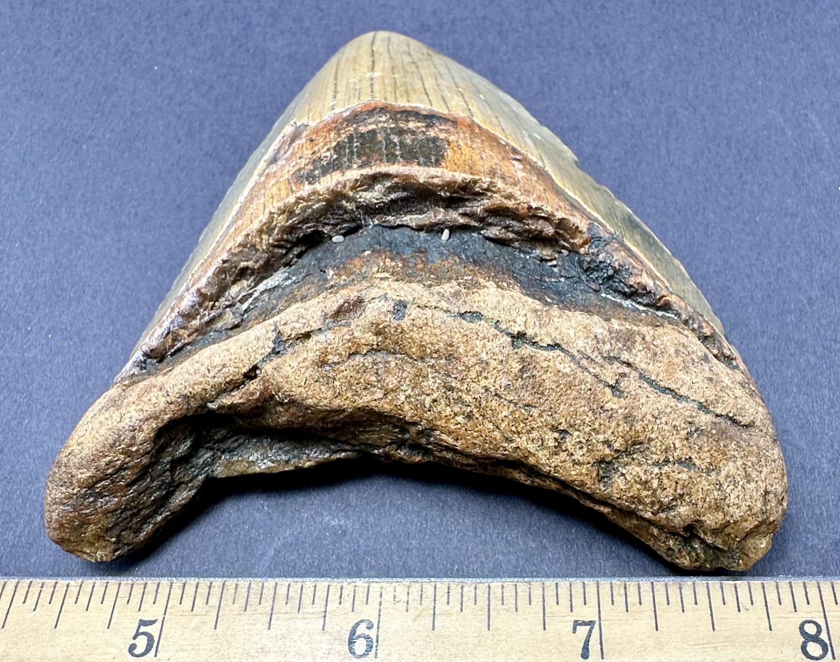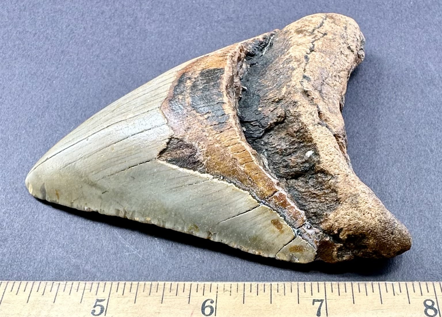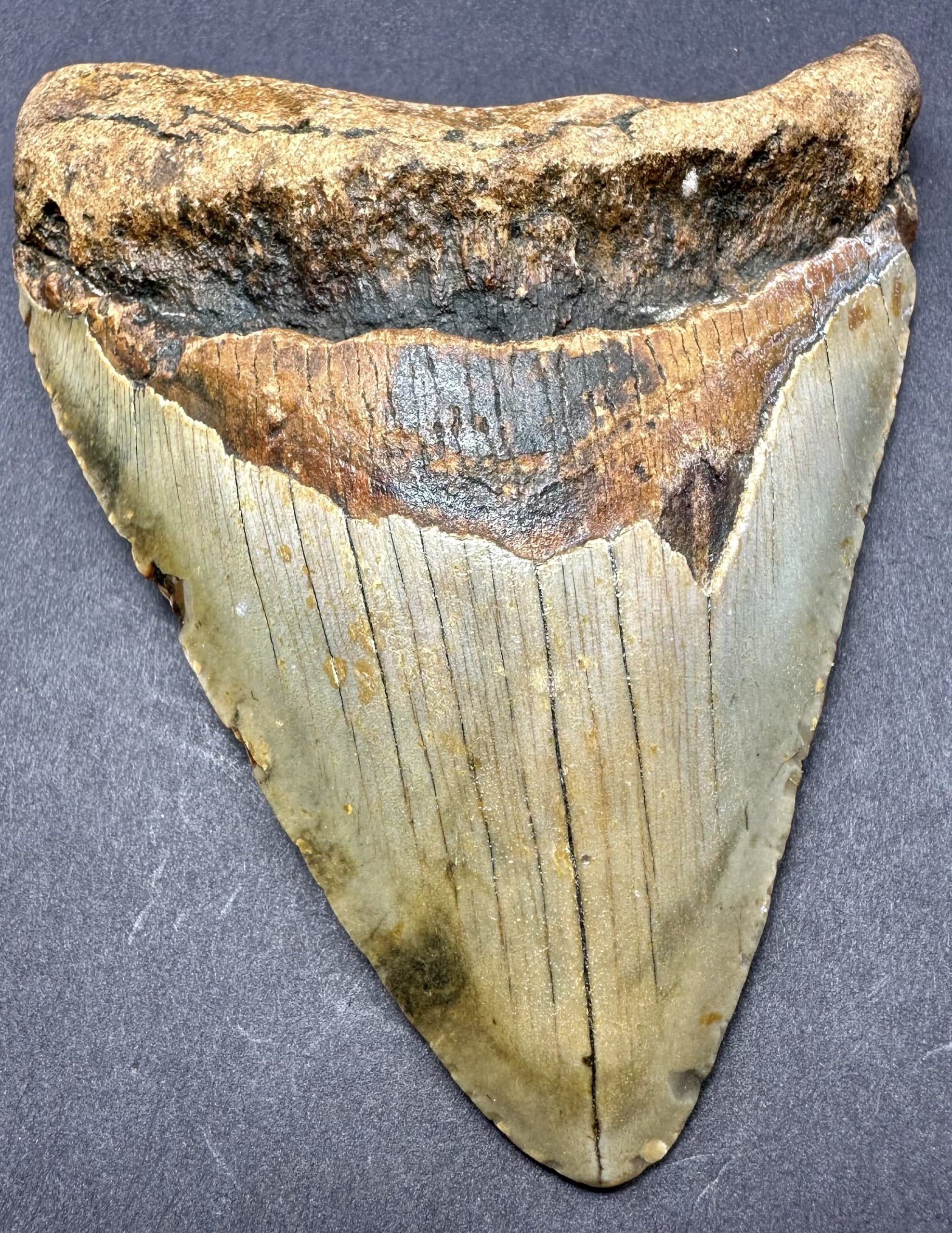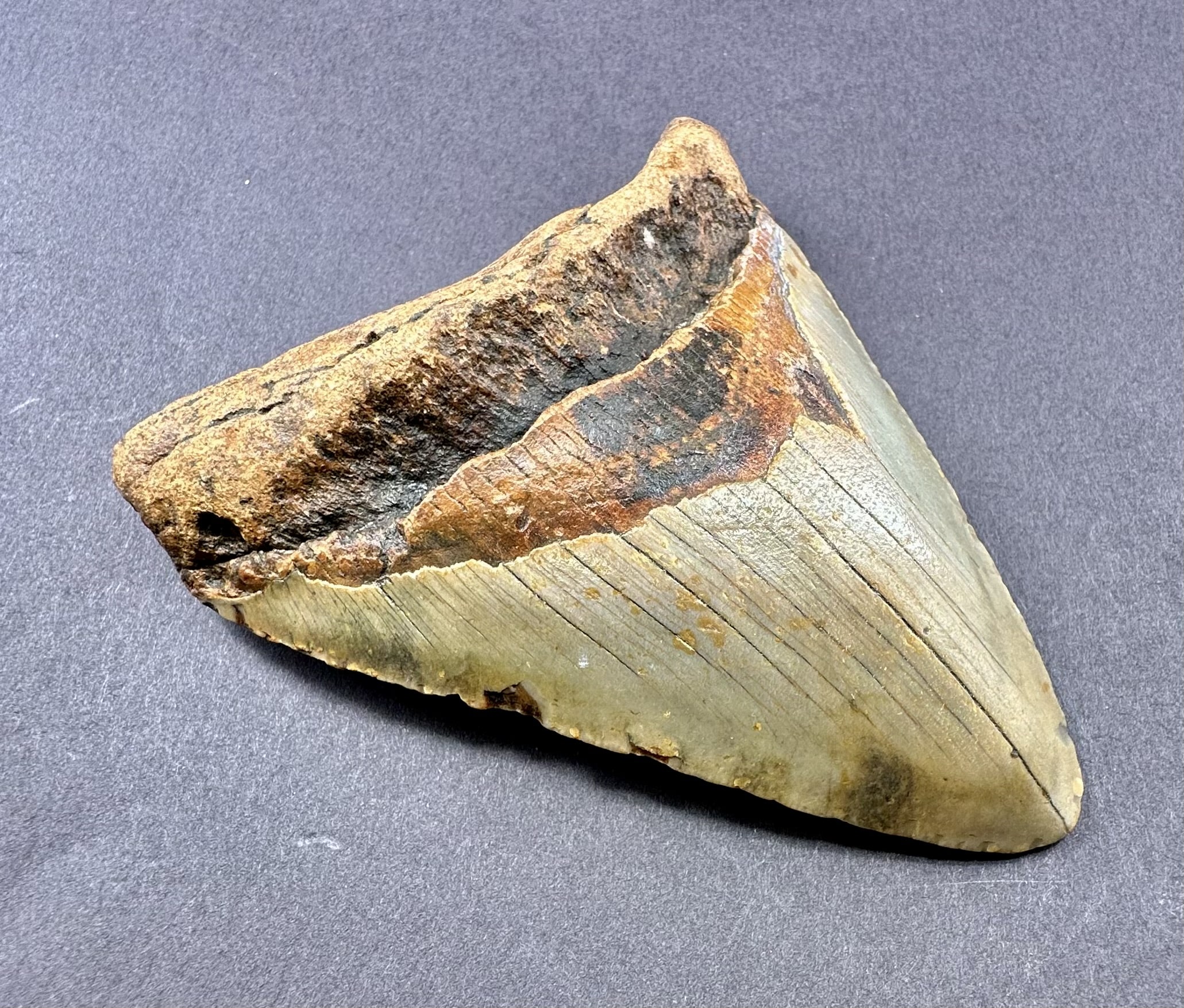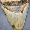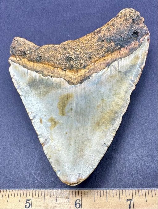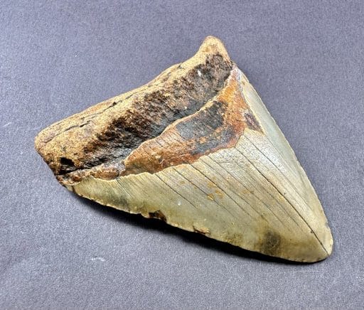 This tooth is from the largest shark ever known to live. The Carcharocles Megalodon sometimes ranged in size up to 60′ in length and weighed over 52 tons. This huge monster is the largest predatory fish that ever lived, second only in size to the sperm whale. Fossil teeth have been found that exceed 7 inches in length. These sharks lived in the Miocene period some 23 million years ago to the Mid Pliocene times, 3.6 million years ago. This specimen is from South Carolina.