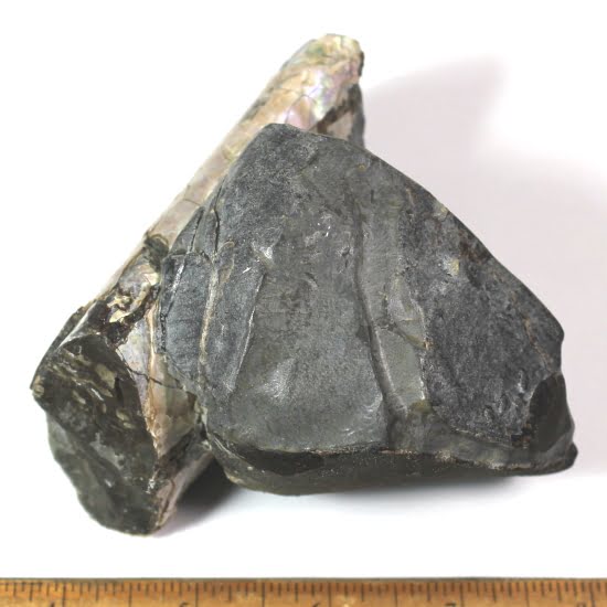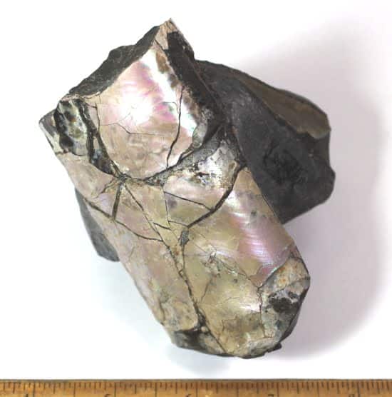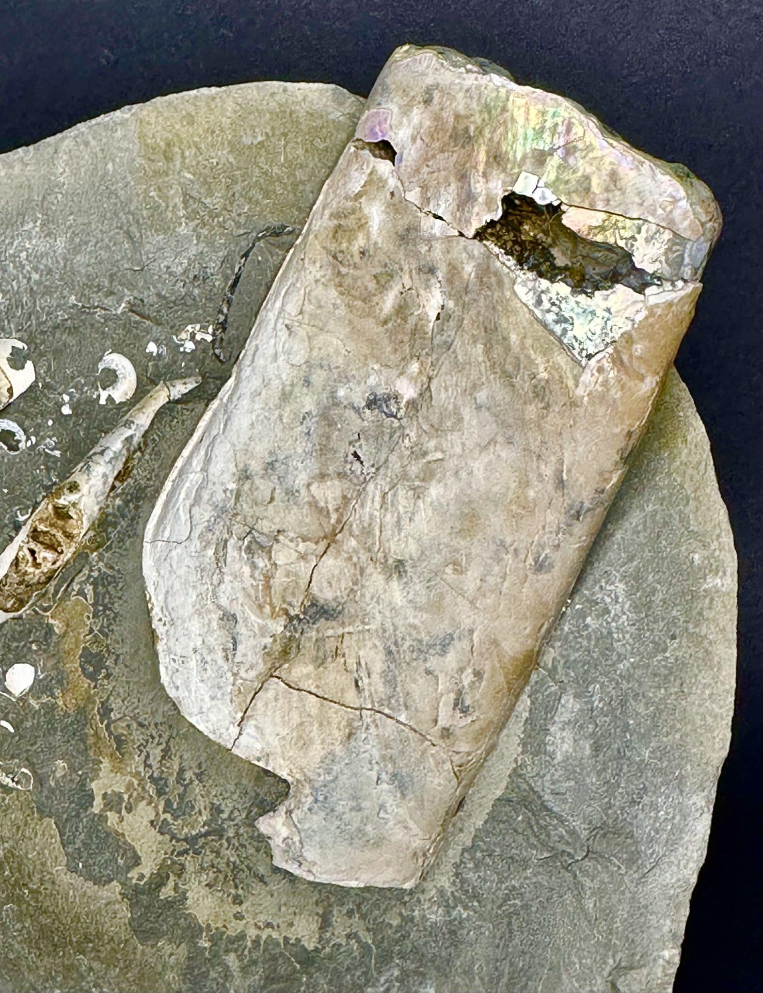 Appearance: This well-preserved fossil imbedded in a matrix has good detail and some colorful “iridescence”.