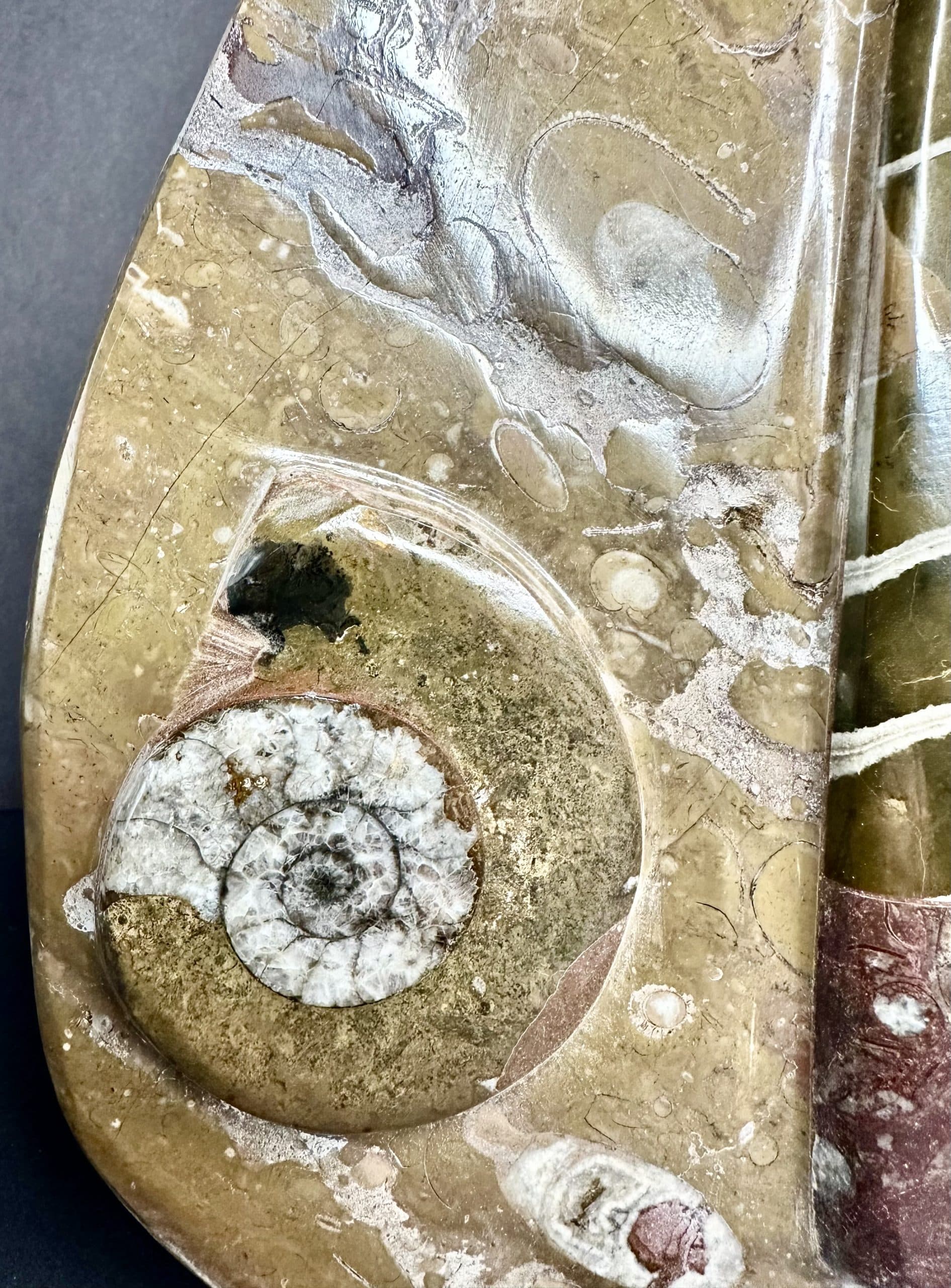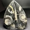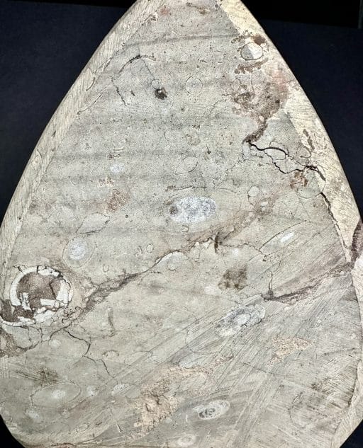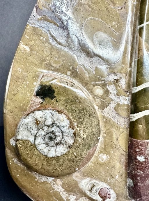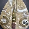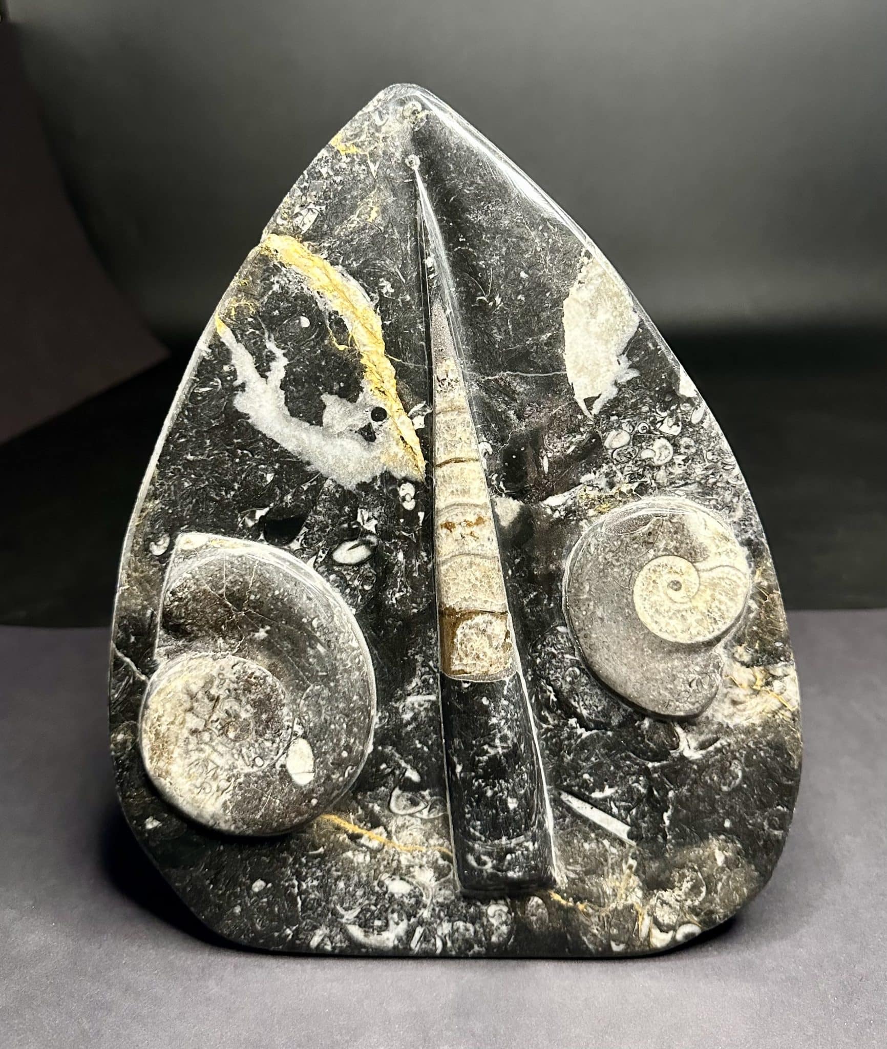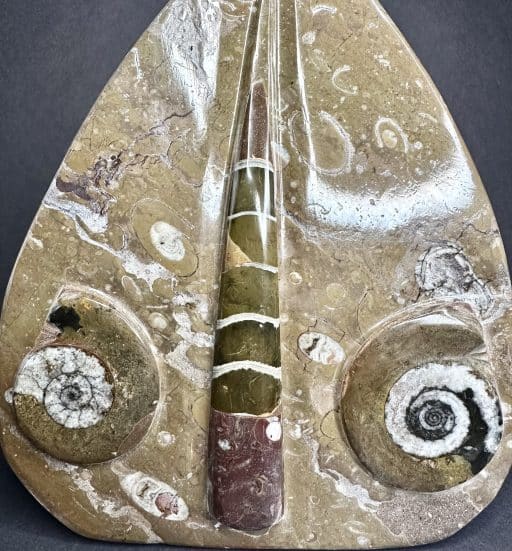 These Moroccan fossils are among the oldest cephalopods. They were abundant during the Paleozoic era some 350 MM years ago and now make up the Atlas Mountain range of central Morocco. There were two Nautiloid forms present in the Moroccan Devonian Sea. The Goniatites is an extinct relative of the Ammonites, it possessed an external shell, which is has a spiral form with internal chambers. The Orthoceras was straight shelled cephalopod with the internal chambers. They were related to the modern-day chambered nautilus and the squid.