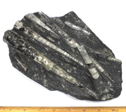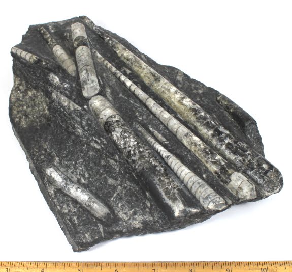 This is a very nice fossil specimen of Orthoceras fossils from Morocco on a medium sized matrix plaque. The detailed Orthoceras fossils were carefully exposed from the rock surrounding them. The all natural and unpolished plaque measures 9 3/8″ x over 6 3/4″ x almost 2″ and weighs nearly 4 1/4 lbs. The fossils on this fossil plaque are as described below and are from Morocco.