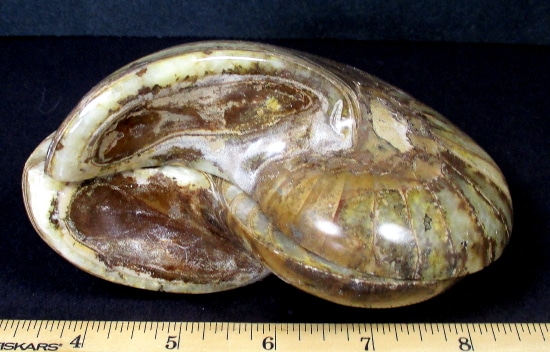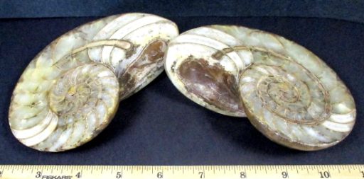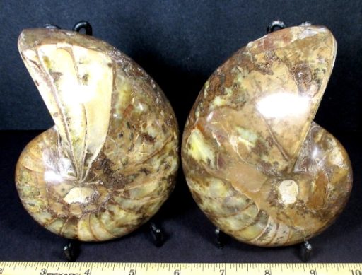 Here is a matched pair of Ammonite halves from Morocco. These Ammonites have been polished on both sides to show its magnificent beauty. It measures 4 5/8″ x 3 1/2″ x 2 3/4″ thick. The Ammonites have various shades of beige and brown.
