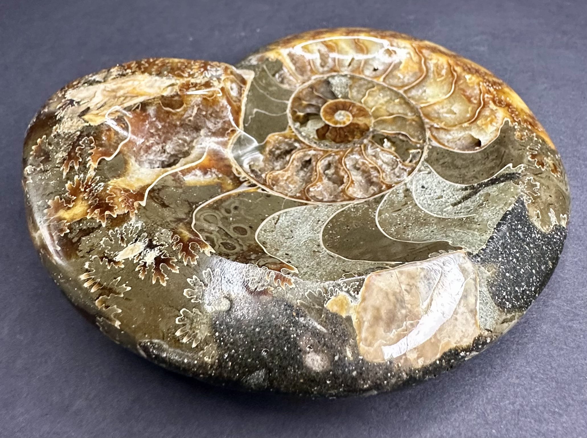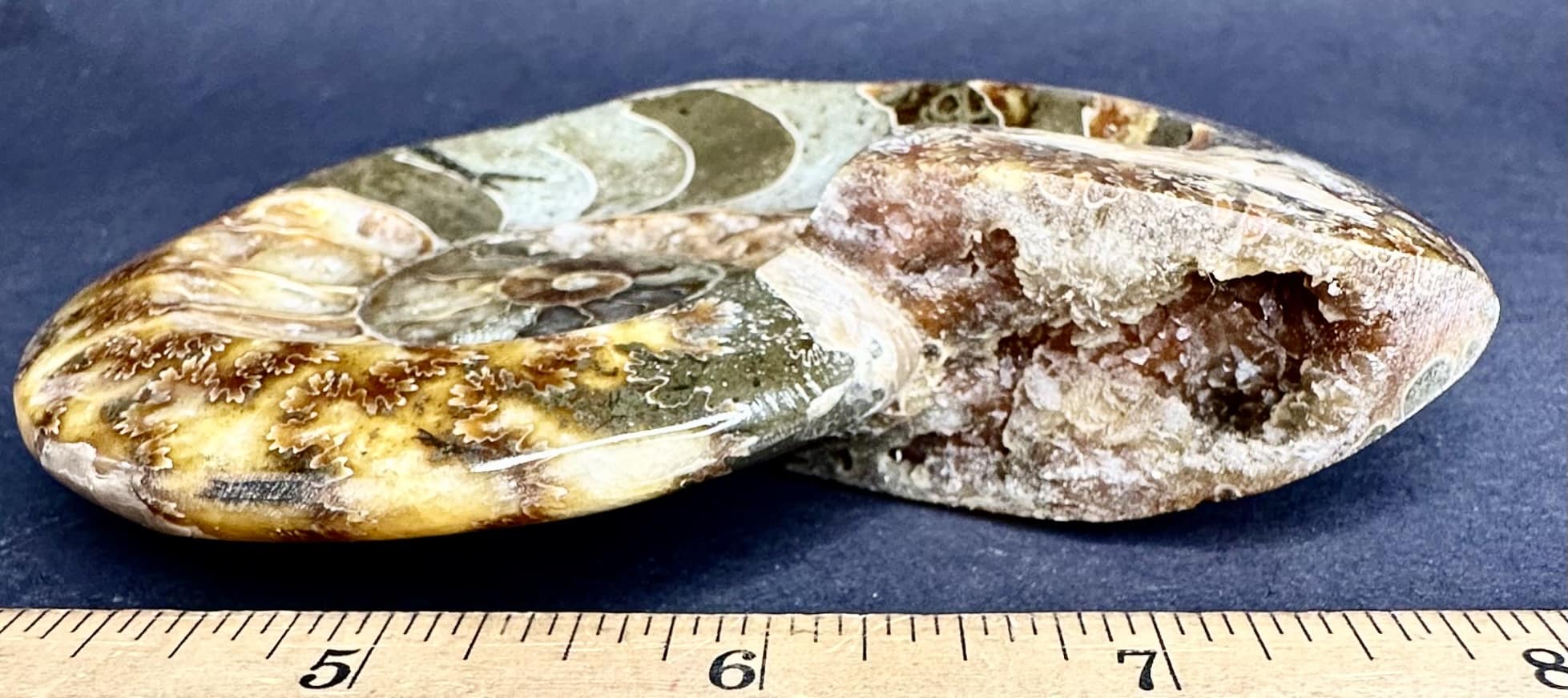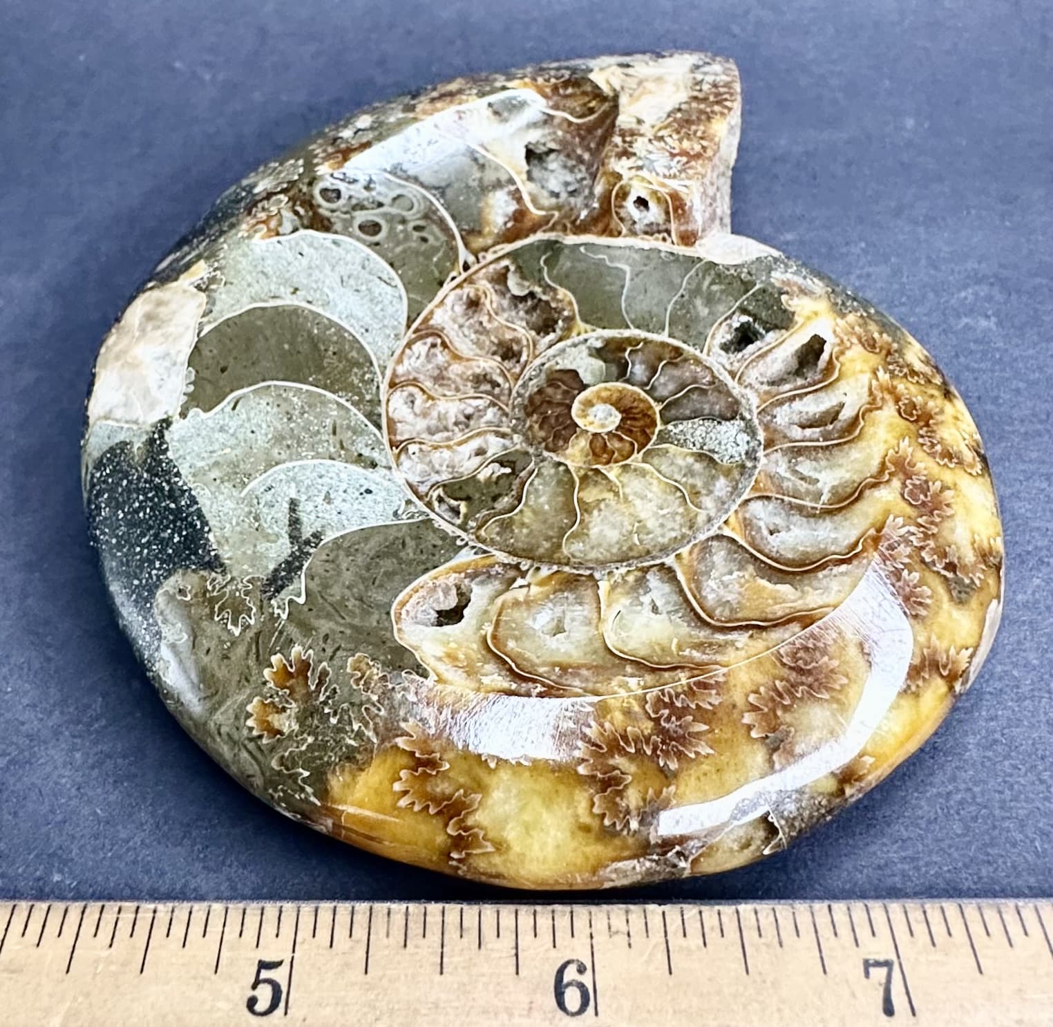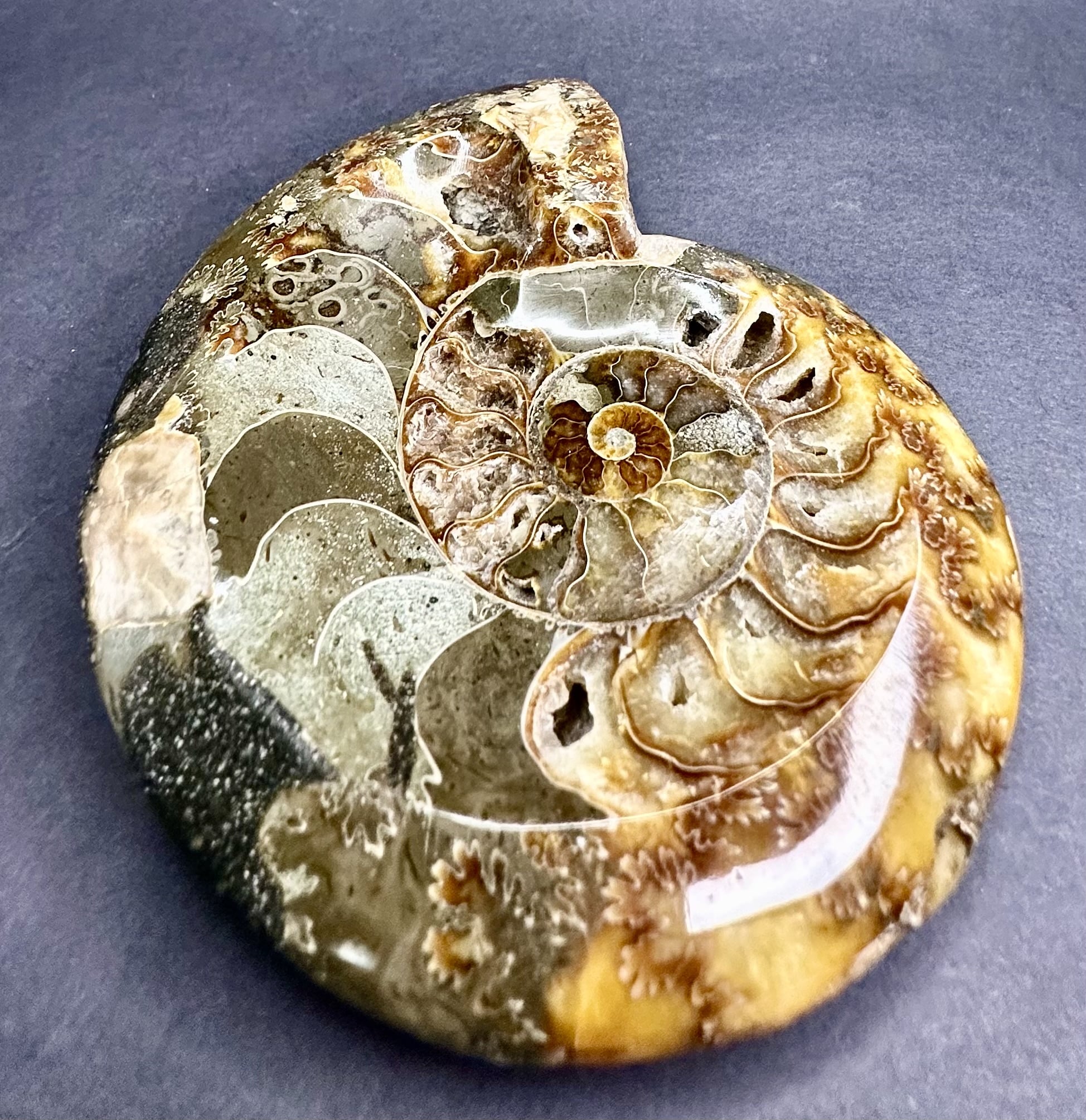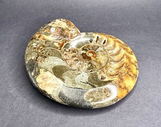 Ammonites are extinct members of the cephalopod group of mollusks. Only a limited number of species have survived to the present day which includes the squid and the chambered nautilus. Ammonites had a multi-chambered shell, and added more chambers as it grew, always living in the outer chamber. They lived in the Cretaceous period some 63 to 130 million years ago.