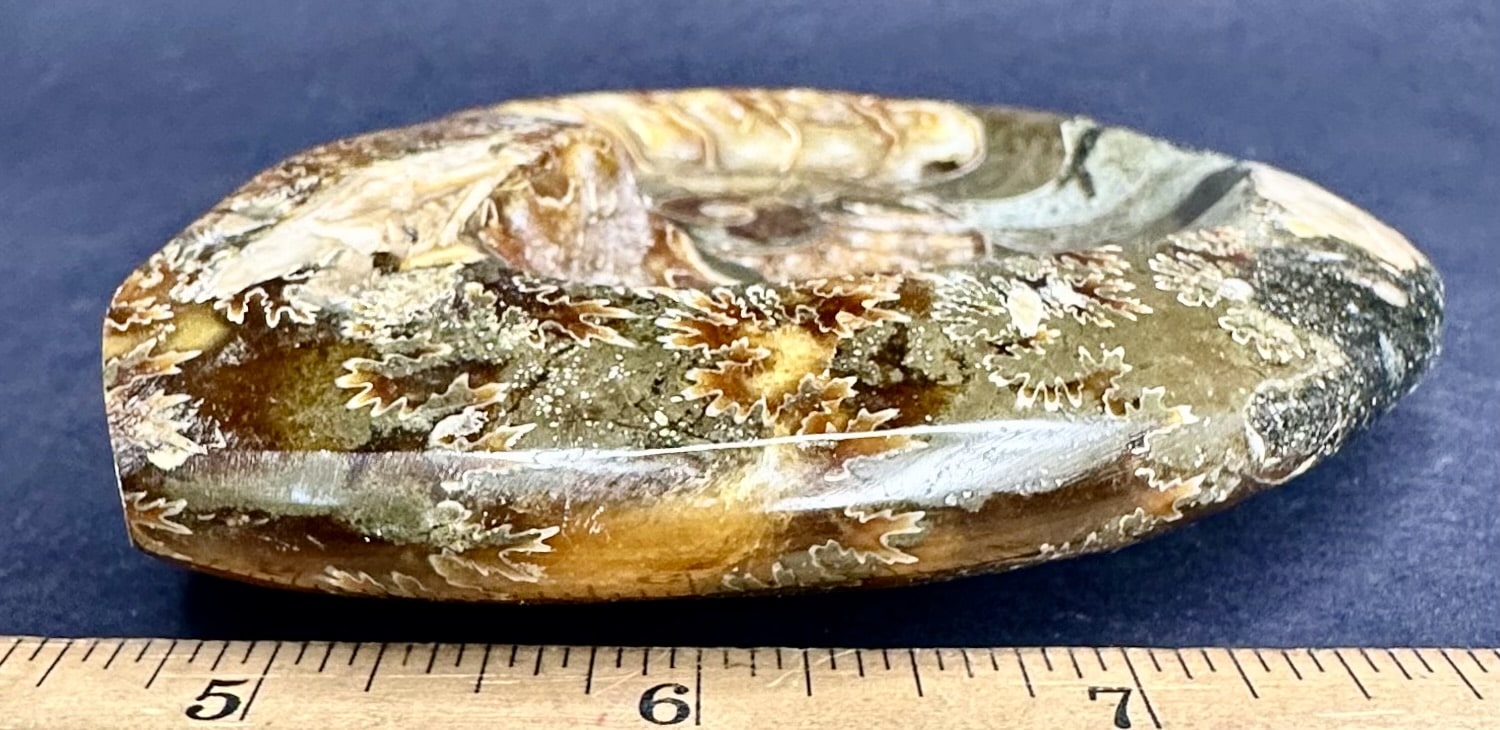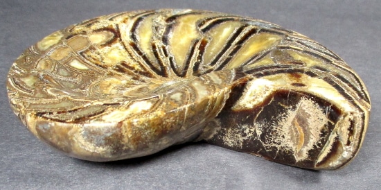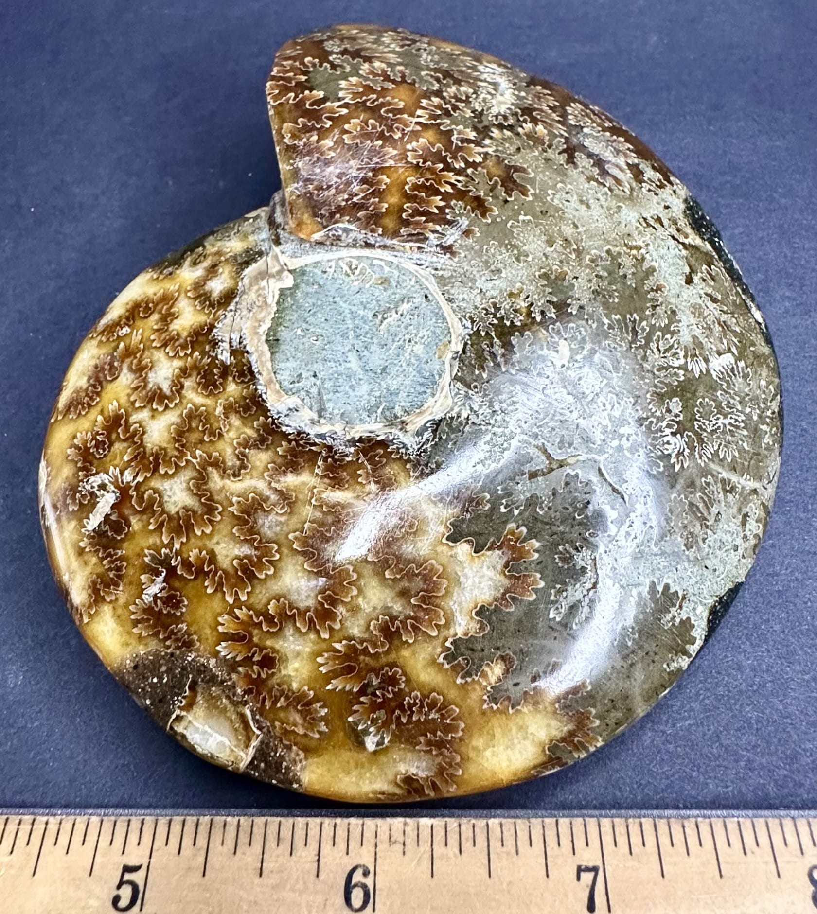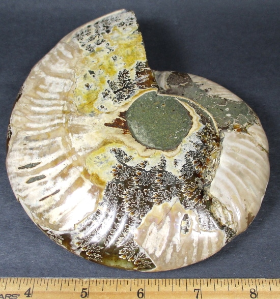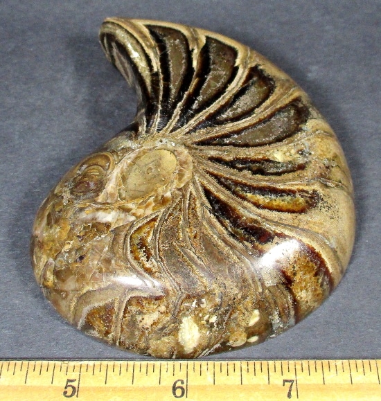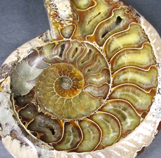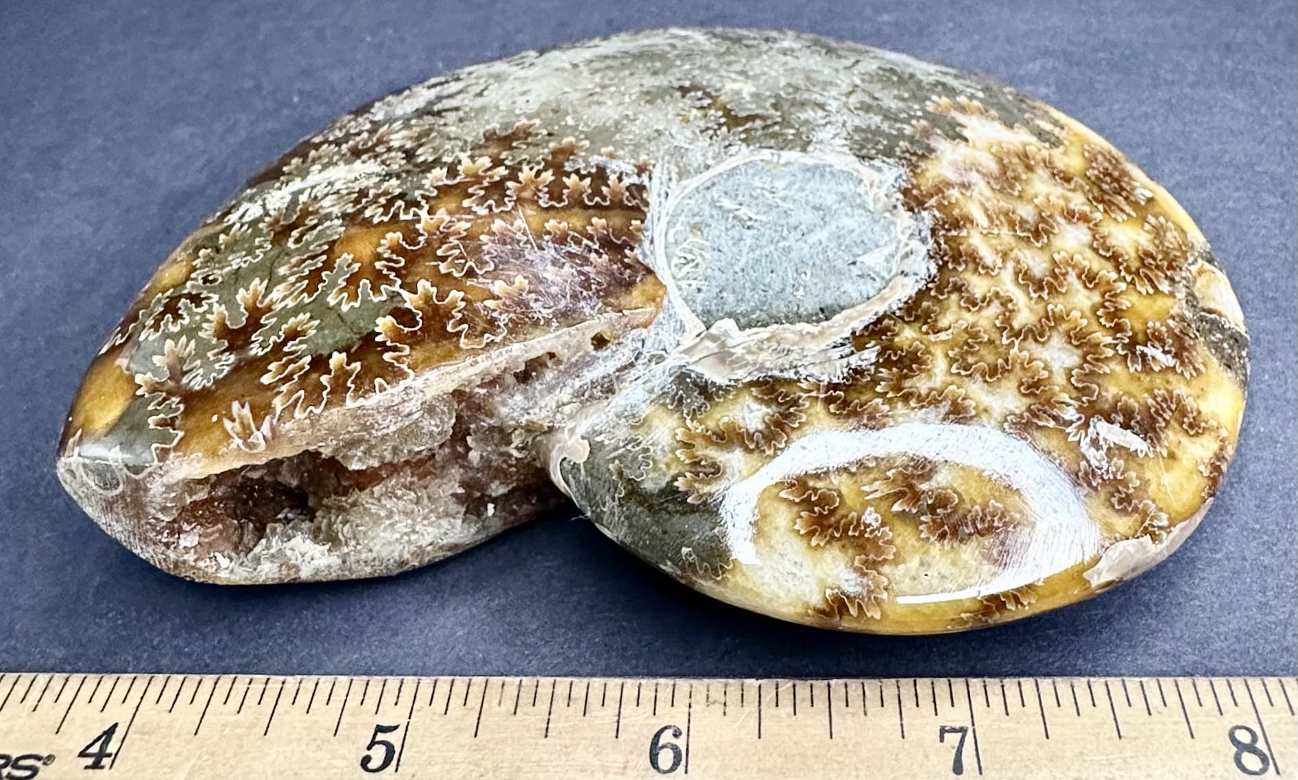 Ammonites are extinct members of the cephalopod group of mollusks. Only a limited number of species have survived to the present day which includes the squid and the chambered nautilus. Ammonites had a multi-chambered shell, and added more chambers as it grew, always living in the outer chamber. They lived in the Cretaceous period some 63 to 130 million years ago.