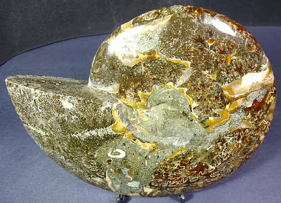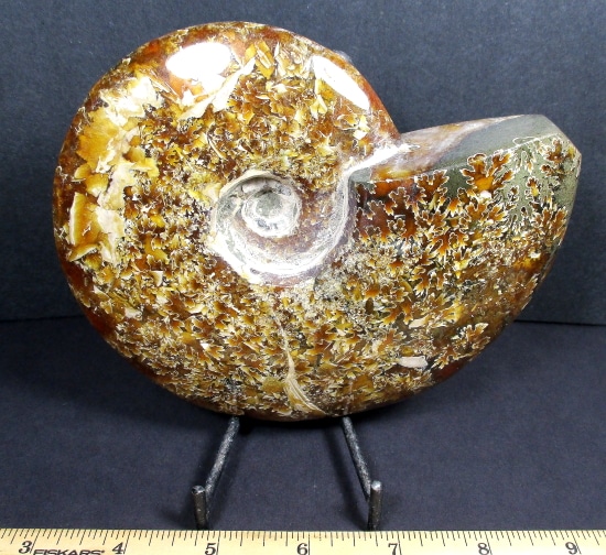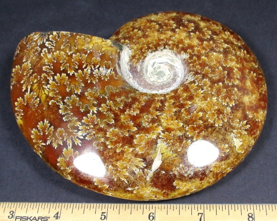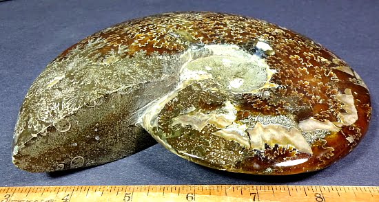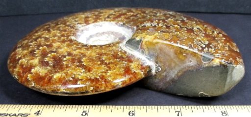 Ammonites are extinct members of the cephalopod group of mollusks. Only a limited number of species have survived to the present day which includes the squid and the chambered nautilus. Ammonites had a multi-chambered shell, and added more chambers as it grew, always living in the outer chamber. They lived in the Cretaceous period some 63 to 130 million years ago.