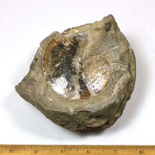 The Sphenodiscus measures nearly 2 1/2″ x over 2 1/4″ in a fossilized matrix measuring nearly 4 1/4″ x over 4″ x 3 3/8″. The Sphenodiscus has a natural, iridescent, pearl-like finish. These fossils make great gifts or work wonderful as an educational tool for school, scouts or clubs. Close observation will reveal several other partial to semi-complete fossils throughout the matrix.
