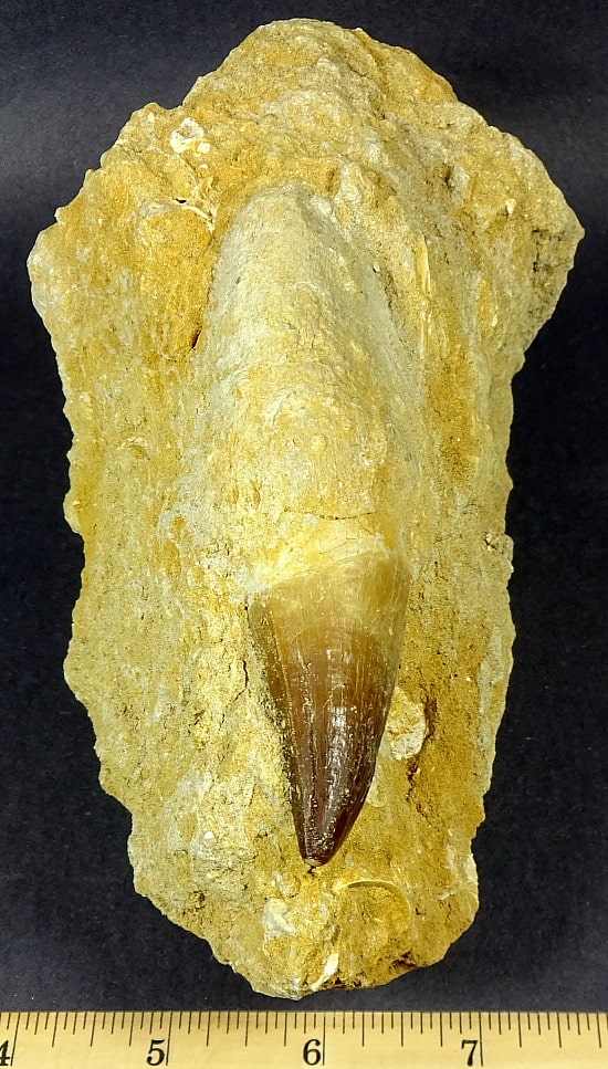 Here is something different for the fossil collector. This is a very nice, above average quality, Mosasaur Tooth in a Matrix. This genuine fossil is from the Cretaceous period, some 75 million years ago. The large tooth is approximately 4 1/4″ long x  1 1/4″ wide and has a cool fossil fish vertebrate imbedded in the matrix. This Mosasaur fossil tooth rests in a sandstone matrix that measures 7″ x 4″ x 4 1/8″. They make a great conversation piece as well as collectible for the fossil collection.