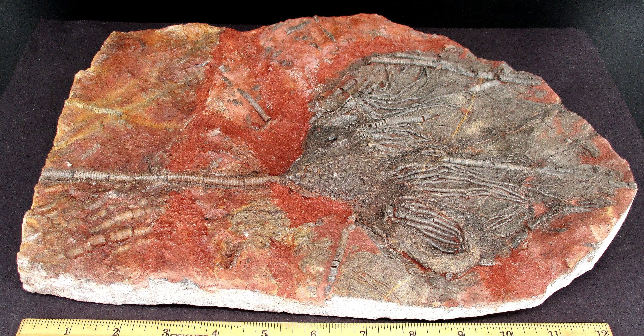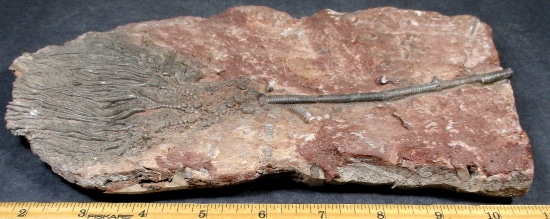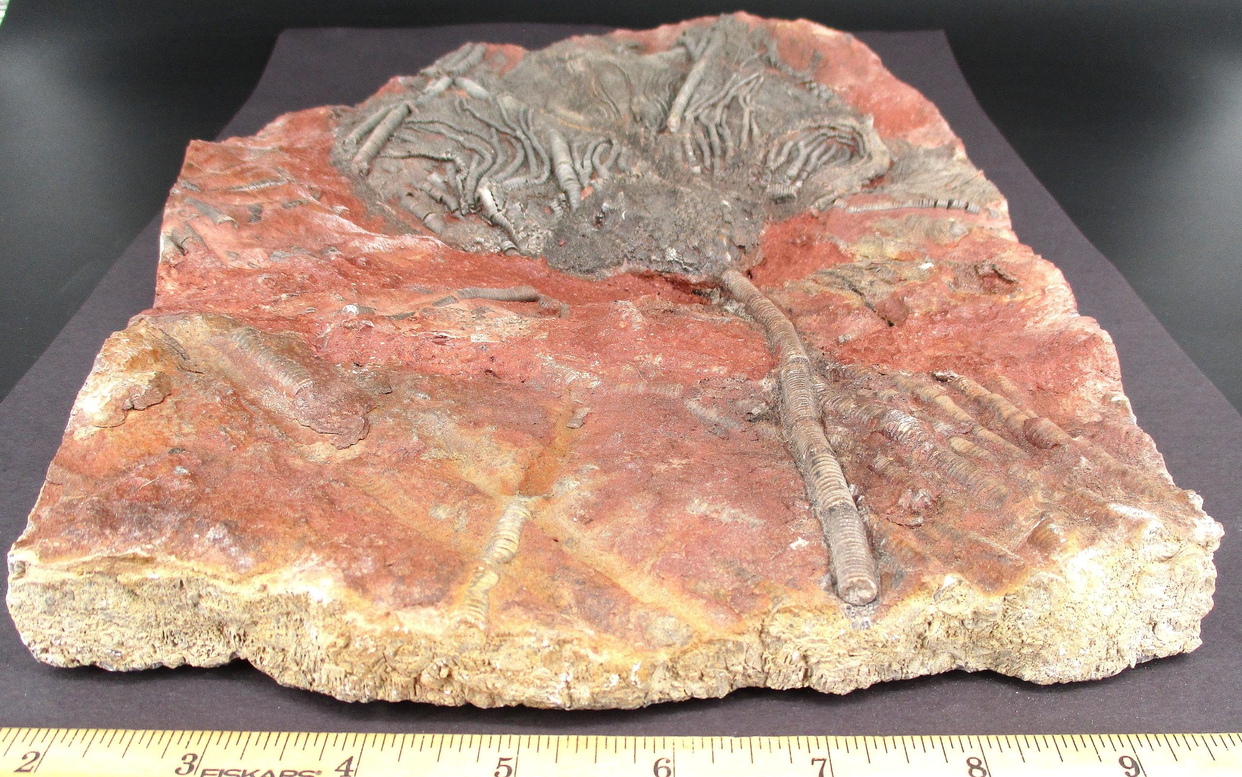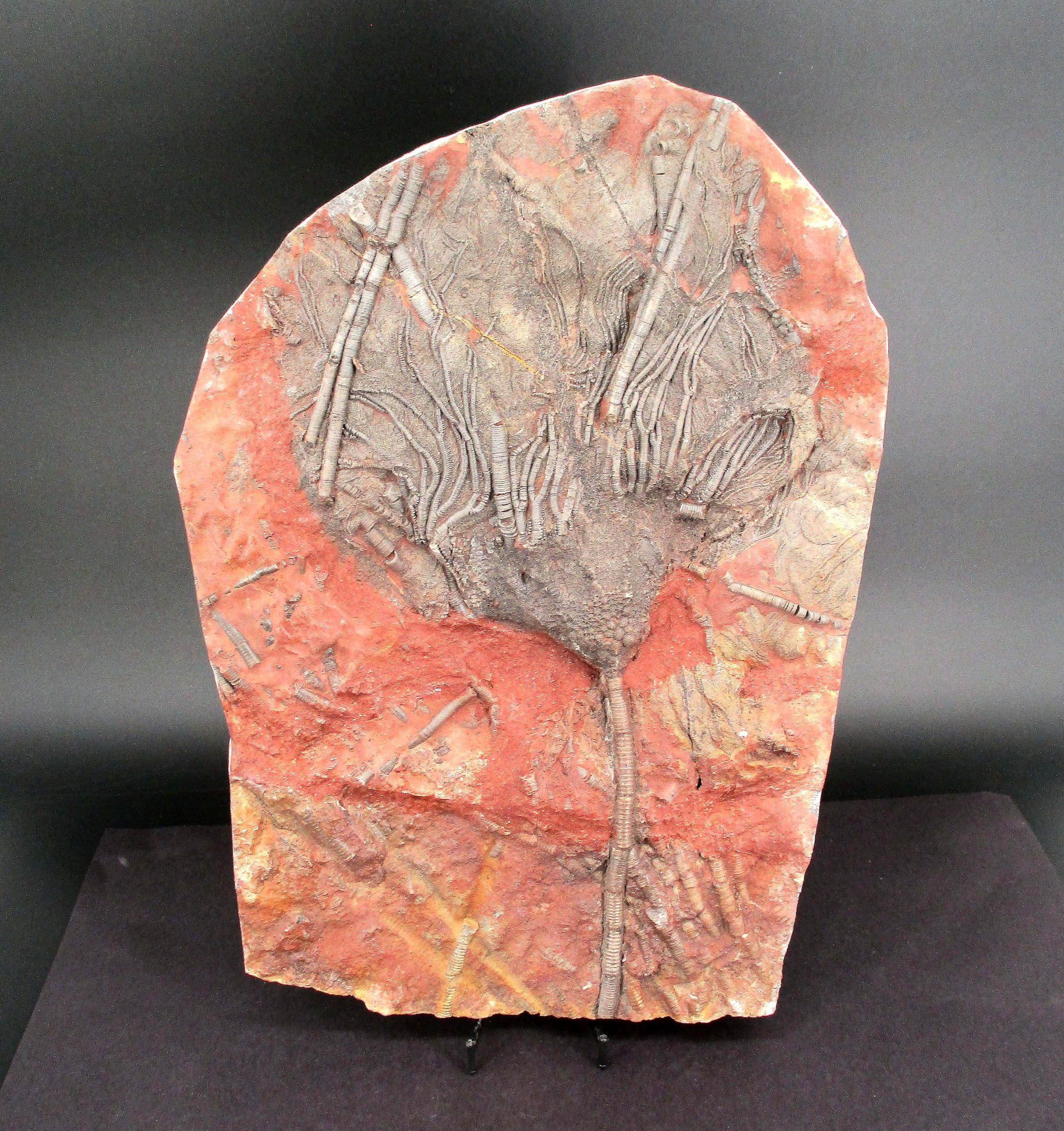 Crinoids are a fascinating species, and this fossil is equally as fascinating. Crinoids are echinoderms and are a filter feeding, plant like marine animal and first appeared on the earth’s surface over 500 million years ago in the Cambrian Era. Stemmed crinoids flourished in the Paleozoic seas with their remains abundant in Paleozoic rock sequences. Today a close relative of the Crinoid still survives at the bottom of the ocean and is usually referred to as a “sea lily.”