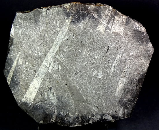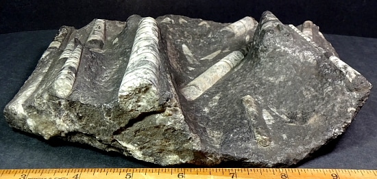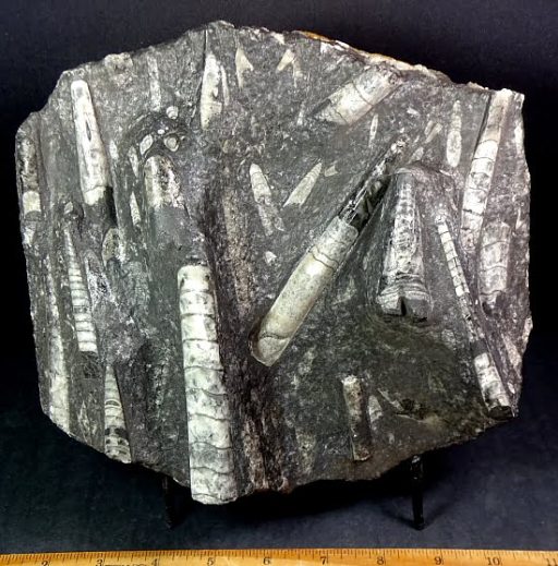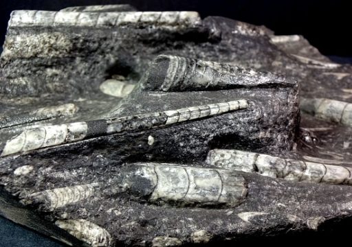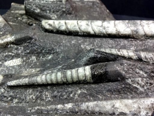 Orthoceras is a genus of extinct Nautiloid Cephalopod. These fossils are common and have a global distribution which occur in any marine rock, especially Limestone. These are slender, elongated shells with the middle of the body chamber transversely constricted and a sub-central orthochoanitic siphuncle. The surface is ornamented by a network of fine lirae or fine lines/ridges.