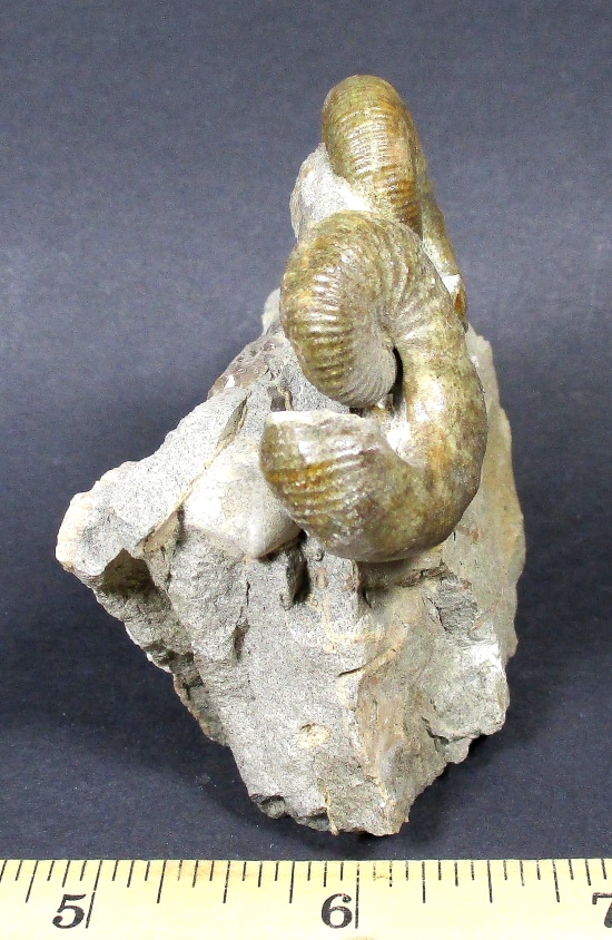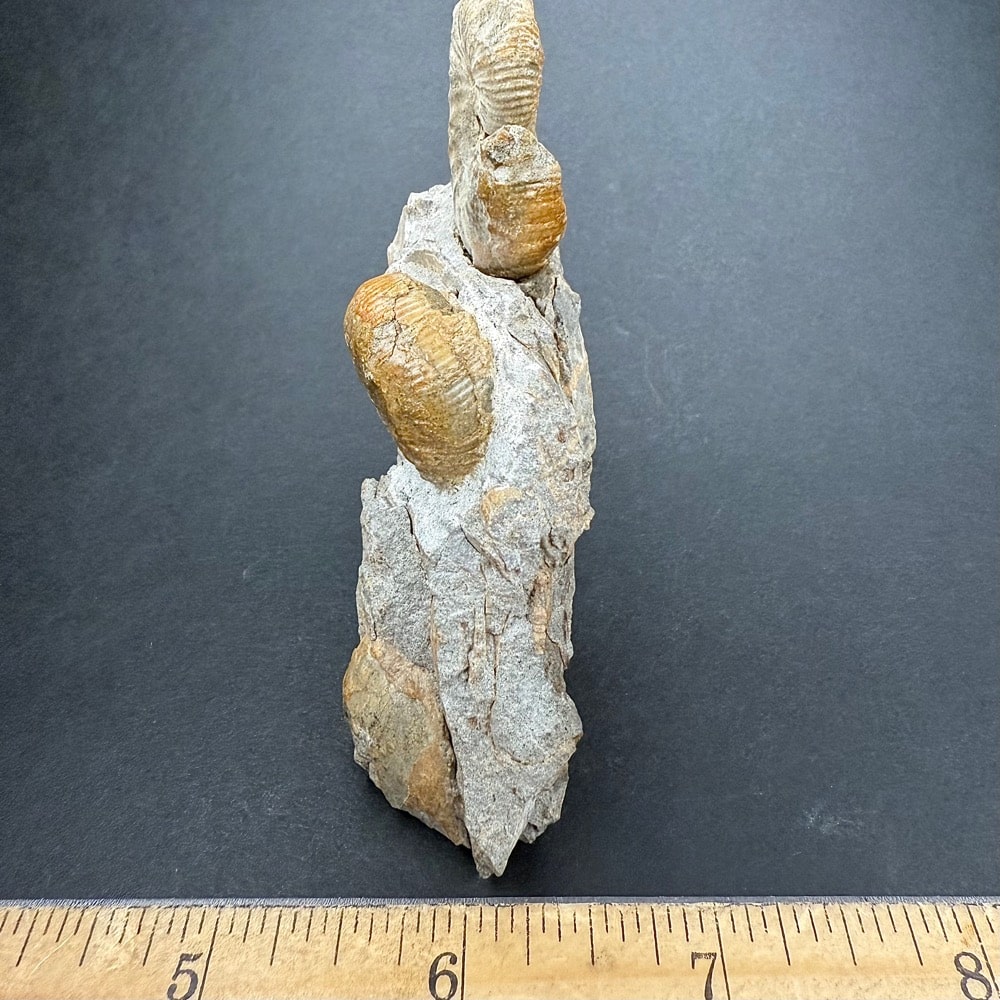 Approximate measurements: LxWxH – 3″ x 1″ x 3 1/4″. Ammonite – 1″ x 3/8″.