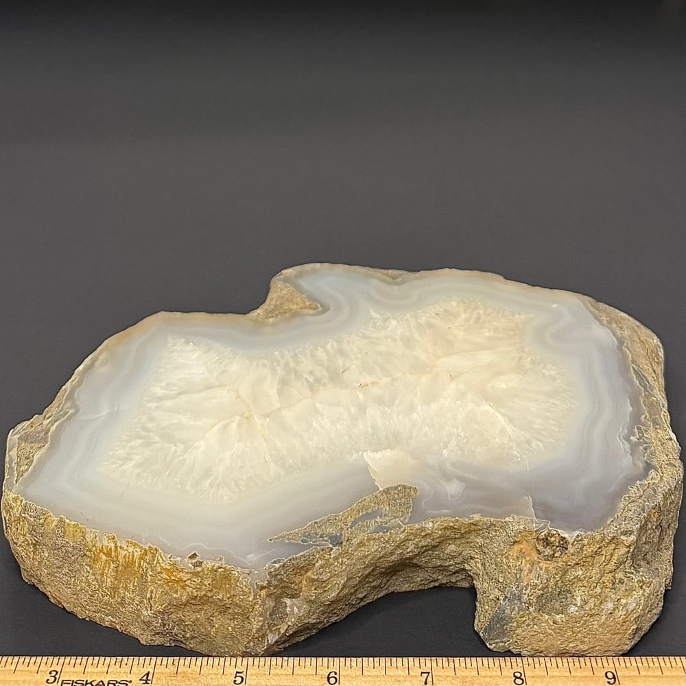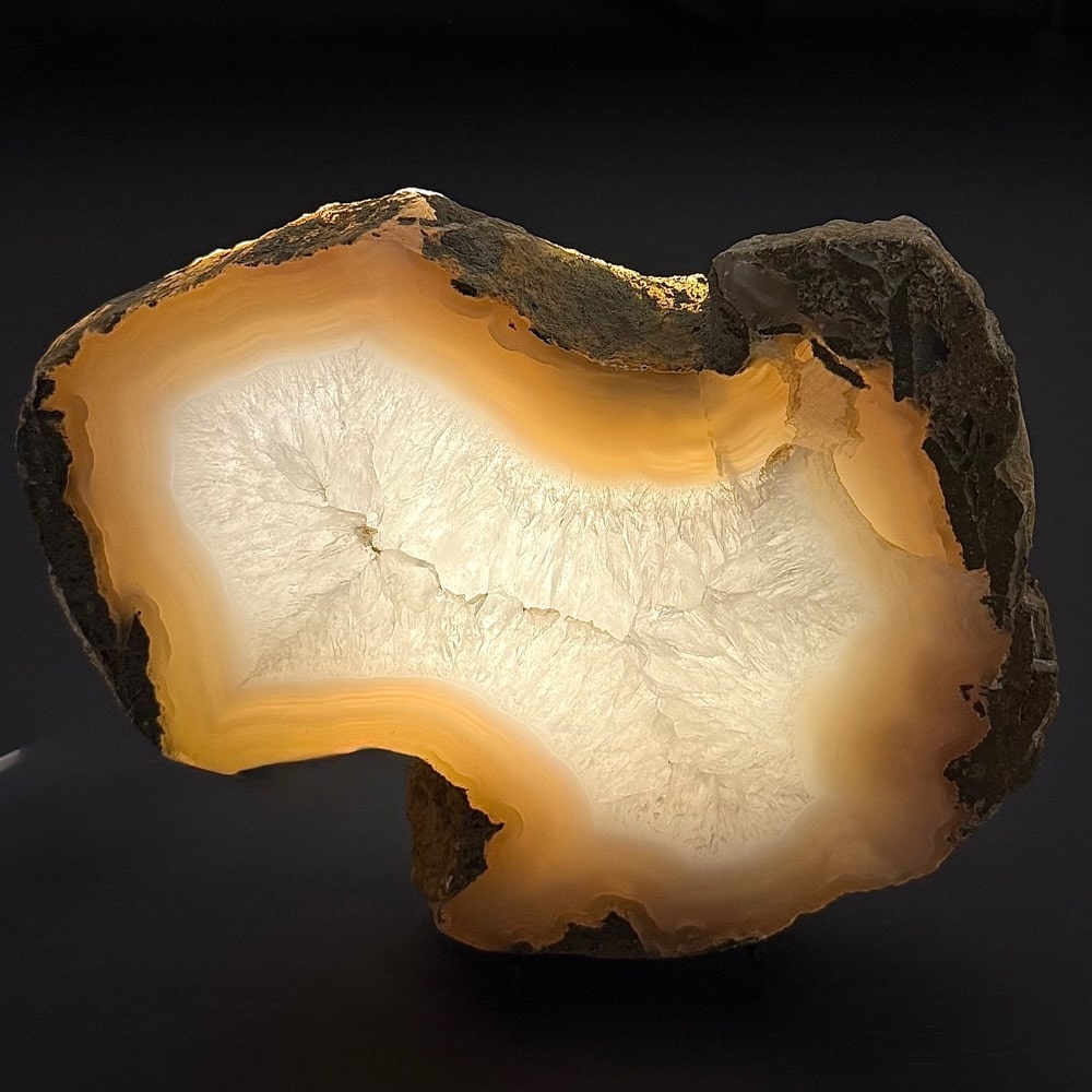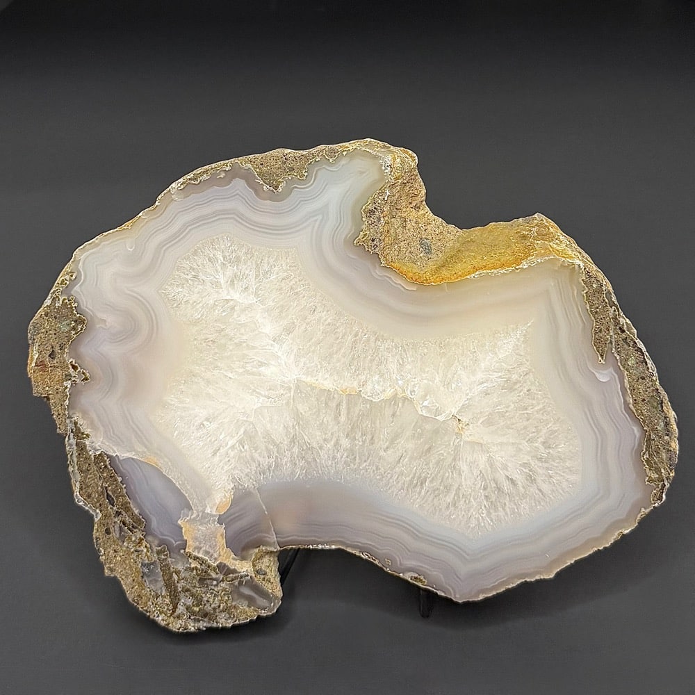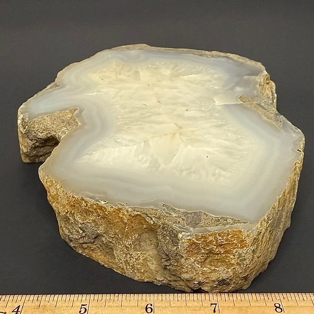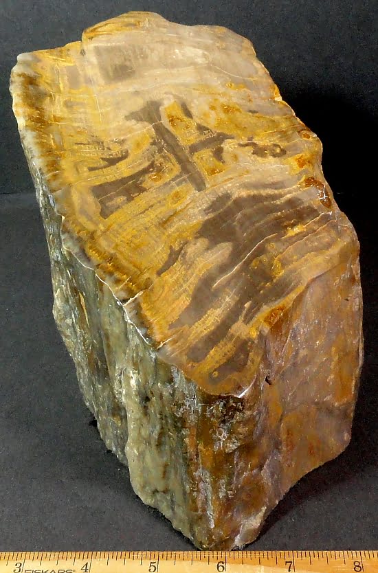 Appearance: It has a good polish on the front side bringing out the internal character while leaving the remaining in its natural state. It resembles a Brazilian Agate with its crystal and banding but is indeed a Petrified Wood. Another fabulous creation from our Lapidary Department!