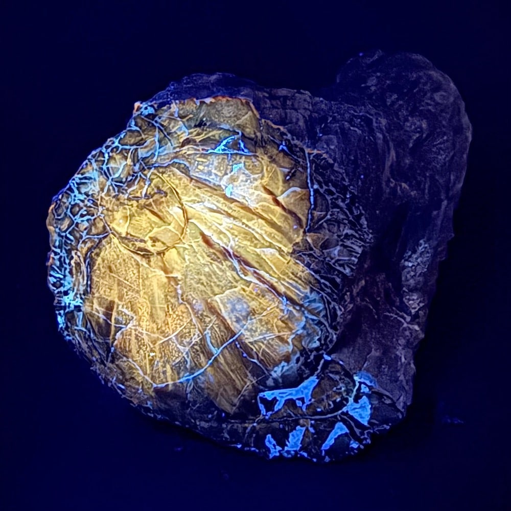 Appearance: It has a good polish on the one end bringing out the internal character while leaving the remaining in its natural state. UV fluorescent. A wonderful creation from our Lapidary Department.