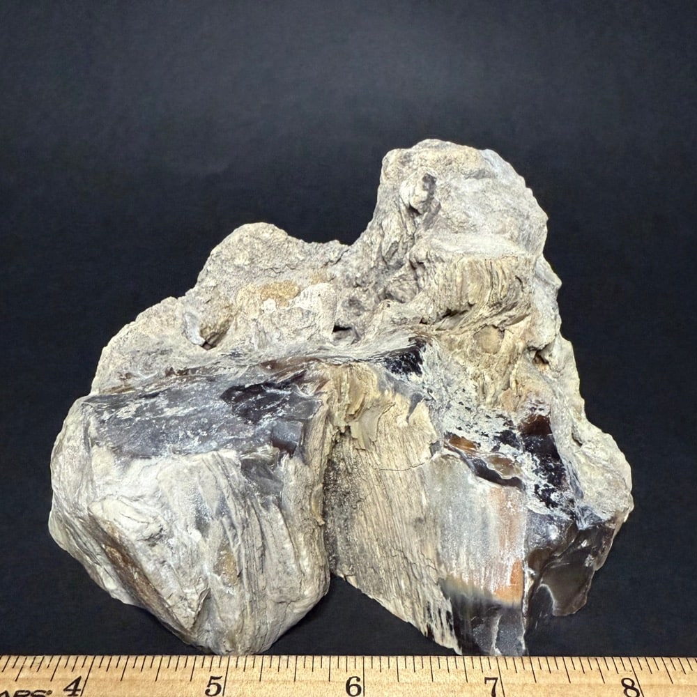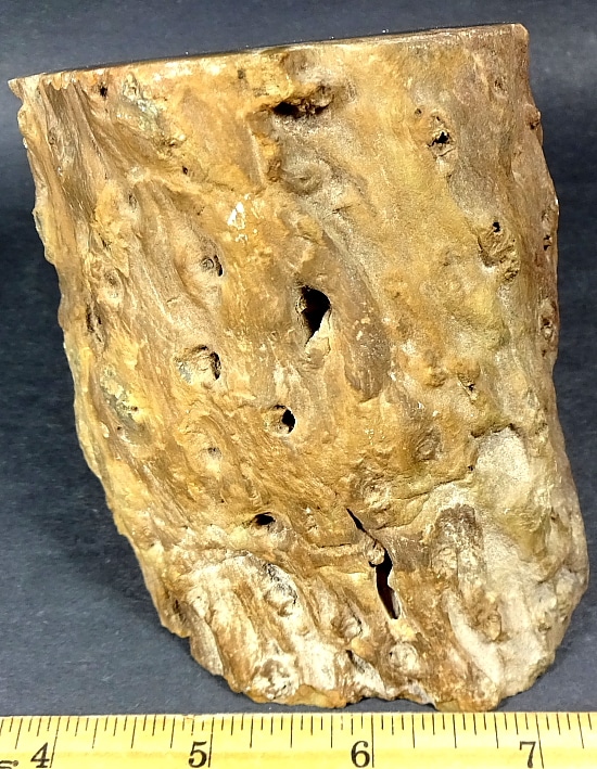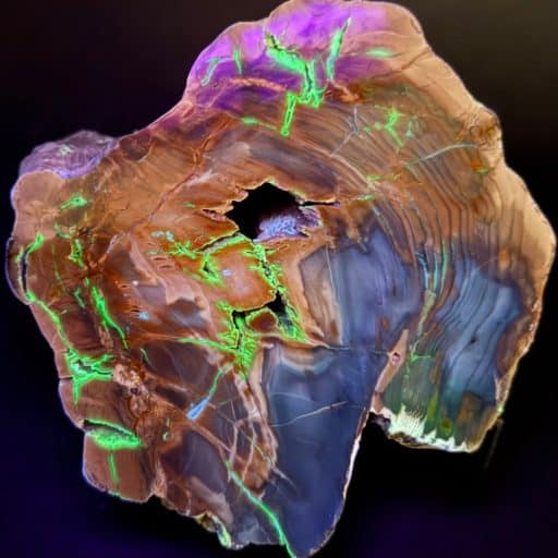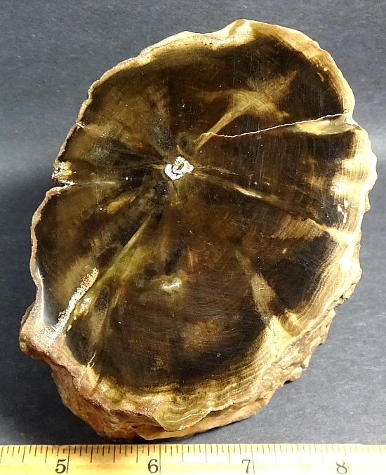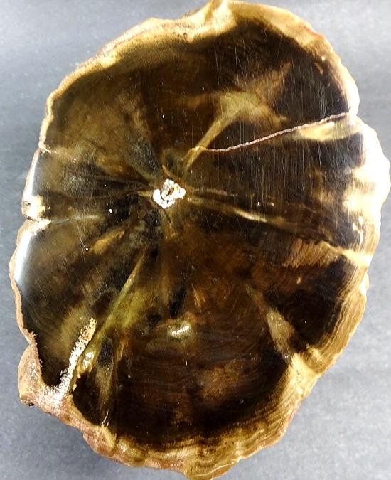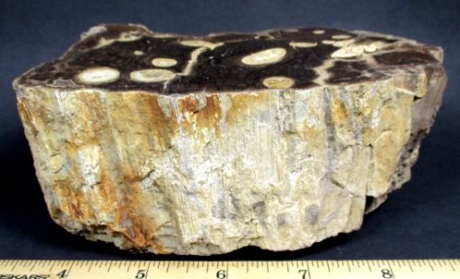 Petrified Wood is a type of a fossil as it consists of fossil wood where all the organic materials have been replaced with minerals while retaining the original structure of the wood.  These minerals are most often Silicates such as Quartz.  Other minerals, Manganese, Iron and Copper, in the water or mud during the petrification process give Petrified Wood a variety of color ranges: black – Carbon; green/blue – Copper; red/brown/yellow – Iron.  Petrified Wood can preserve the original structure of the wood in all its detail all the way down to the microscopic level.  Structures such as tree rings and the various tissues are often observed features.  Although Petrified Wood can be found worldwide, it is rather rare in larger quantities and at times can be difficult to obtain by the average collector.