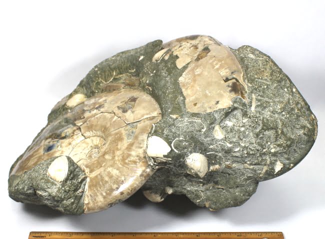 Ammonites are extinct members of the cephalopod group of mollusks. Only a limited number of species have survived to the present day which includes the squid and the chambered nautilus. Ammonites had a multi-chambered shell, and added more chambers as it grew, always living in the outer chamber. They lived in the Cretaceous period some 63 to 130 million years ago.