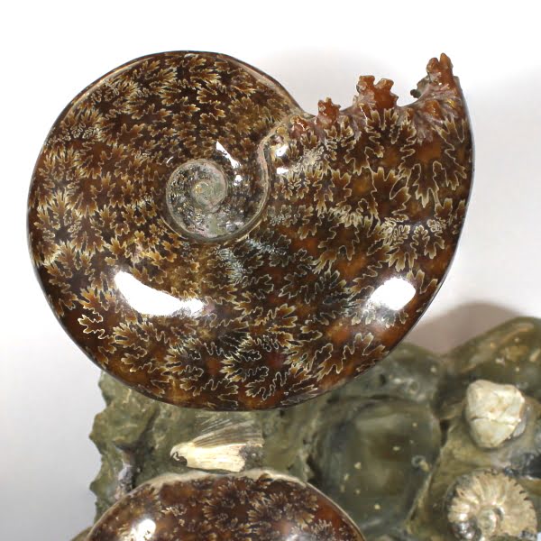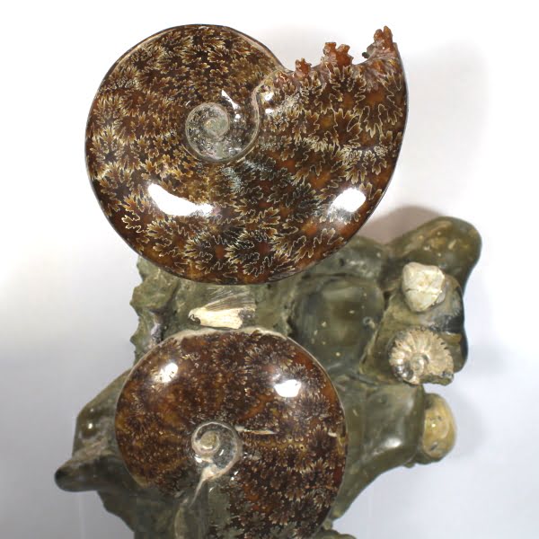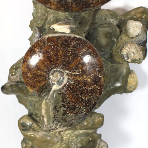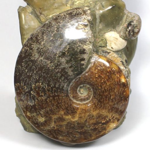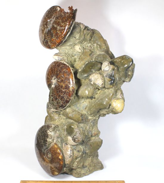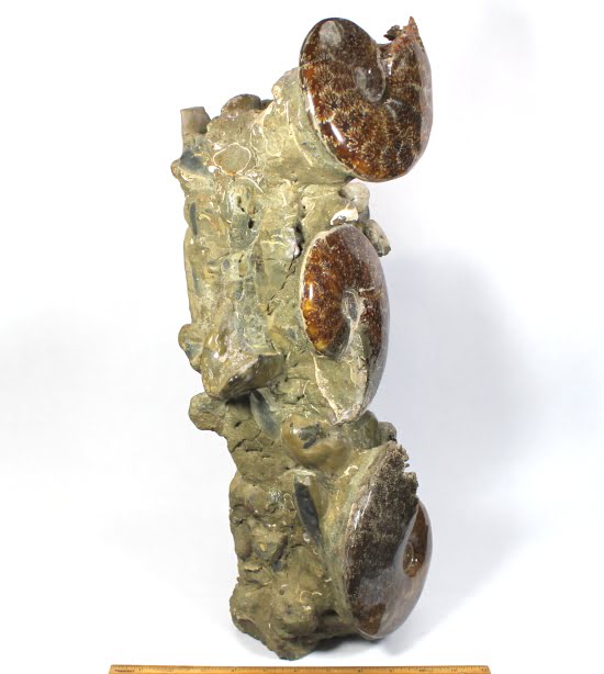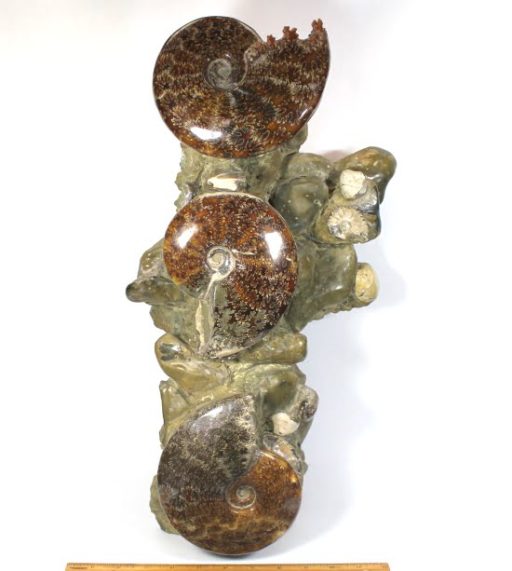 This is an incredibly magnificent specimen of multiple Ammonites with other fossils from Madagascar.  The phenomenal display has 3 large Ammonites flanked by many other Ammonites, Clams, and various other fossils throughout the matrix.   The large upper Ammonite measures over 5 3/4″ x 4 7/8″x 1 1/2″ with a shiny polish and excellent detailed sutures all the way to the aperture.  The middle Ammonite is 5 3/4″ x 4 5/8″ with very good detail, too.  The lower Ammonite is the largest measuring 6 3/8″ x nearly 5 1/4″ with a nice polish as well.  Scattered about are the other partially exposed Ammonites, Clams and other fossils with more discovered from every different angle.  Overall, this fantastic Ammonite fossil specimen measures approximately 19 1/2″ tall x 10 1/4″ x 7 1/2″ and weighs over 36 3/4 pounds.  An absolutely exceptional Ammonite display for any fossil collection!
