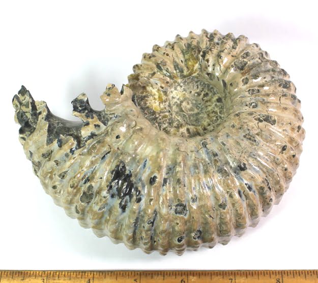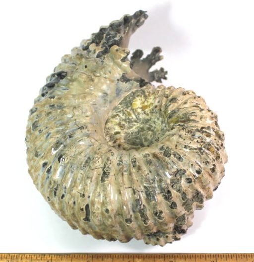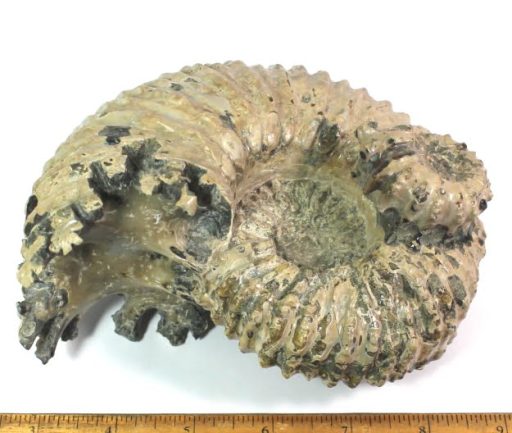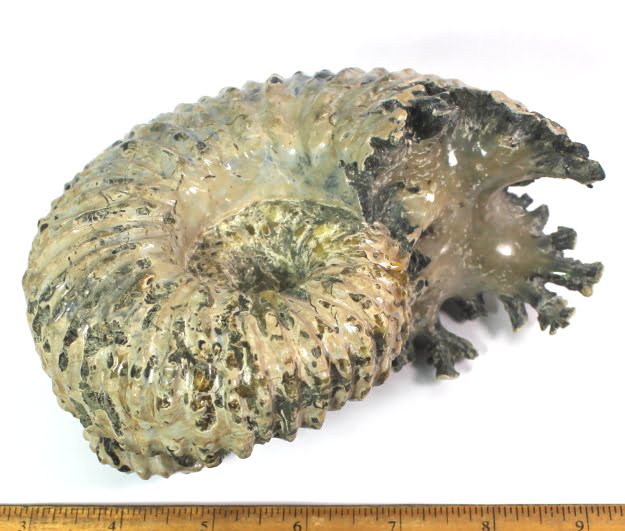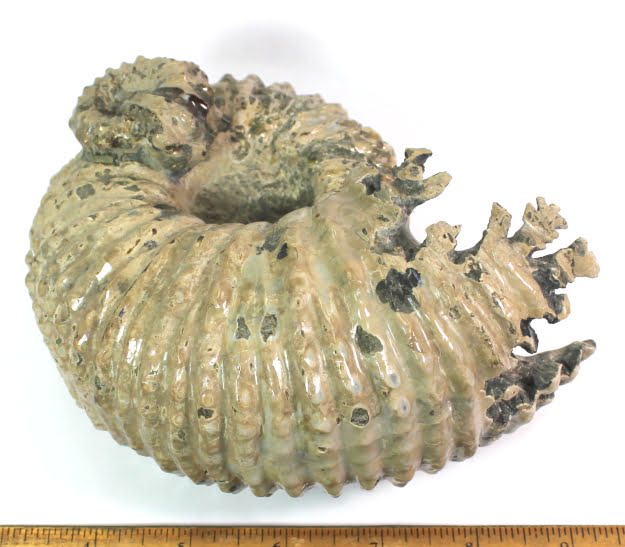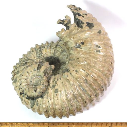 This is an incredibly awesome specimen of Douvilleiceras Ammonites from Madagascar.  The astonishing display has a large Ammonite with a much smaller one attached.  The distinct tubercles and raised ridges form a beautiful pattern along the body of the Ammonite.  It has much of the outer shell and remnants of the mother-of-pearl type iridescence.  The large Ammonite measures 6″ x almost 5″ x nearly 3 3/8″ with a shiny polish and excellent detailed sutures all the way to the aperture.  The small Ammonite is nearly 2″ x 1 1/2″ with very good detail, too.  This wondrous Ammonite fossil specimen weighs nearly 3 1/4 pounds.  An absolutely fabulous Ammonite display for any fossil collection!