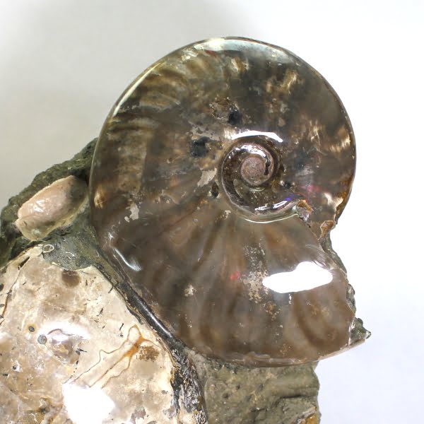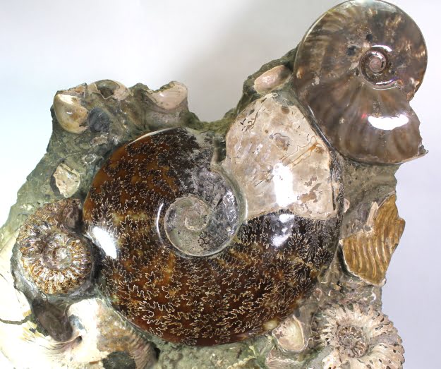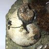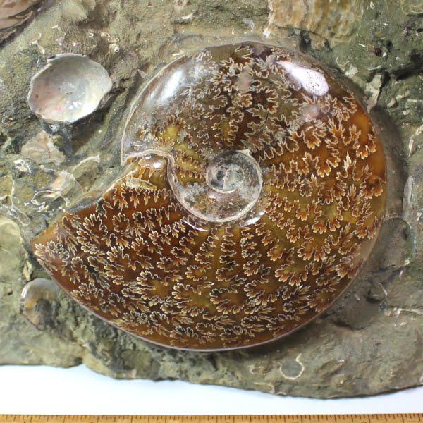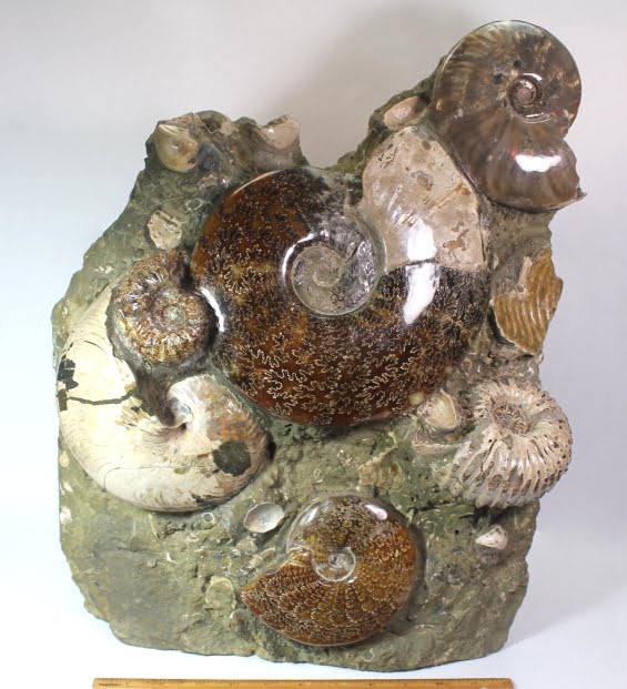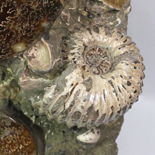 Ammonites are extinct members of the cephalopod group of mollusks. Only a limited number of species have survived to the present day which includes the squid and the chambered nautilus. Ammonites had a multi-chambered shell, and added more chambers as it grew, always living in the outer chamber. They lived in the Cretaceous period some 63 to 130 million years ago.