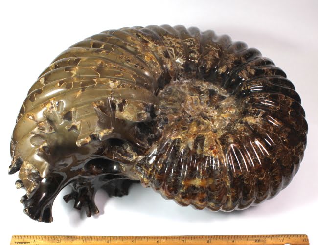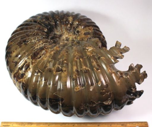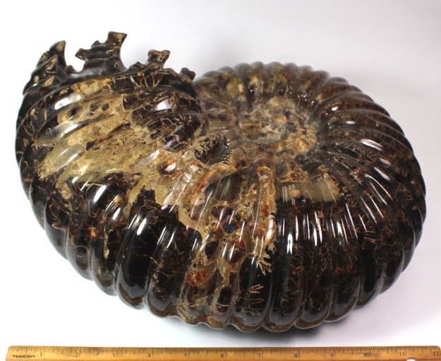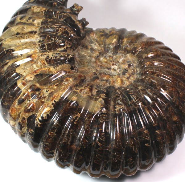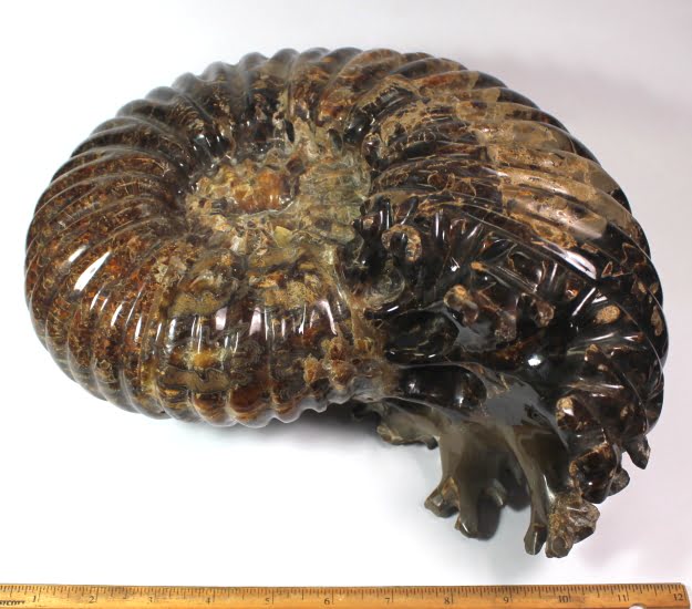 Ammonites are extinct members of the cephalopod group of mollusks. Only a limited number of species have survived to the present day which includes the squid and the chambered nautilus. Ammonites had a multi-chambered shell, and added more chambers as it grew, always living in the outer chamber. They lived in the Cretaceous period some 63 to 130 million years ago.