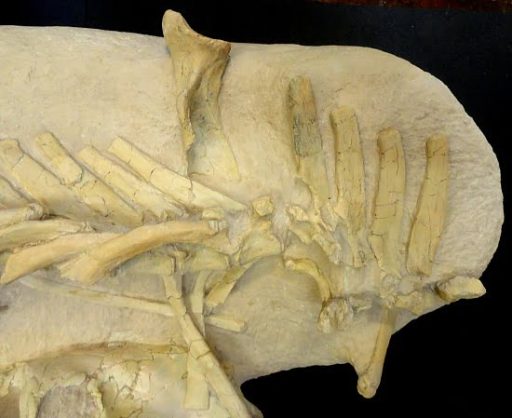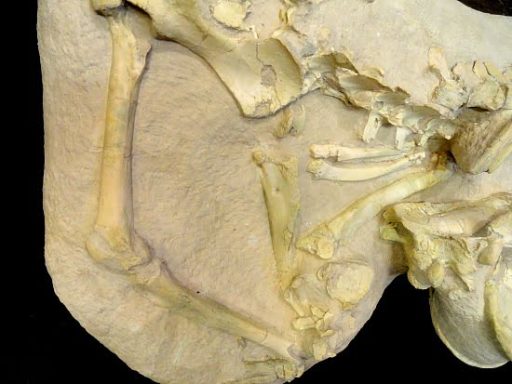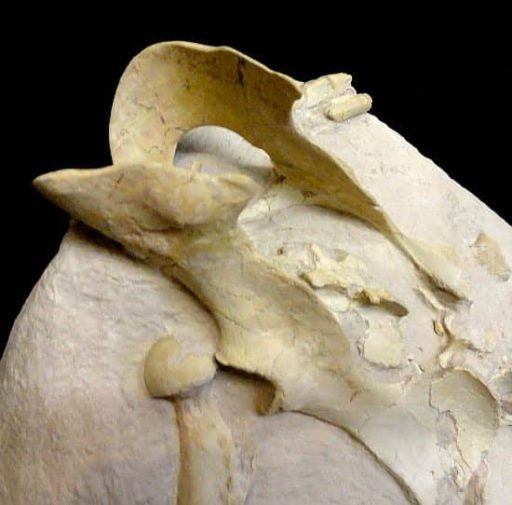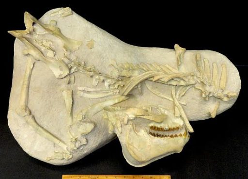 This is an Oreodonta skeleton from the Brule Formation in the White River Badlands of South Dakota.  This was a goat-like species of terrestrial herbivore belonging to the Oreodont family.  This museum quality specimen has been professionally prepped to show it’s nearly complete skull, vertebrae, many of it’s ribs, as well as it’s pelvis, leg and other bones. While in reality, this skeleton is only about 50% complete the bones you do see have had very minimal fill and repair. It measures 25″ long. It is 16″ wide at it’s widest point and angles down to 7″ on the other end. The skull itself measures 10″ long and has been prepped on both sides to show it’s nearly full set of teeth on both sides. It sits in it’s original matrix but has been mounted on top of molders clay to display beautifully at an angle from 3″ high at it’s skull to nearly 11″ high at it’s pelvis. It weighs in at around 110 pounds. A  fossil of this caliber does not come around that often! An excellent addition to any fossil collection!
