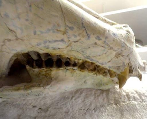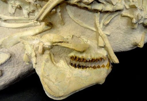 The Oreodonta is an extinct suborder of mammal in Order Artiodactyla, and therefore distantly related to pigs, hogs, camels, hippopotamuses, and the pig-like peccaries.  Over 50 species of Oreodonta have been described. They first appeared some 50 million years ago during the warm Eocene and were widely prevalent during the Oligocene in the grasslands, prairies or savannas of what is now the North American badlands.  Today, fossil jaws and teeth of the Oreodonta are commonly found in the White River badlands in South Dakota, Nebraska, and Wyoming.  Oreodonts are Artiodactyls, even toed ungulates, sometimes called a cross between a pig and a sheep. Note that they have both large canine front teeth, but also molars for chewing plants.  They were herding animals and grazers, eating mostly grasses.  They averaged three to four feet long.